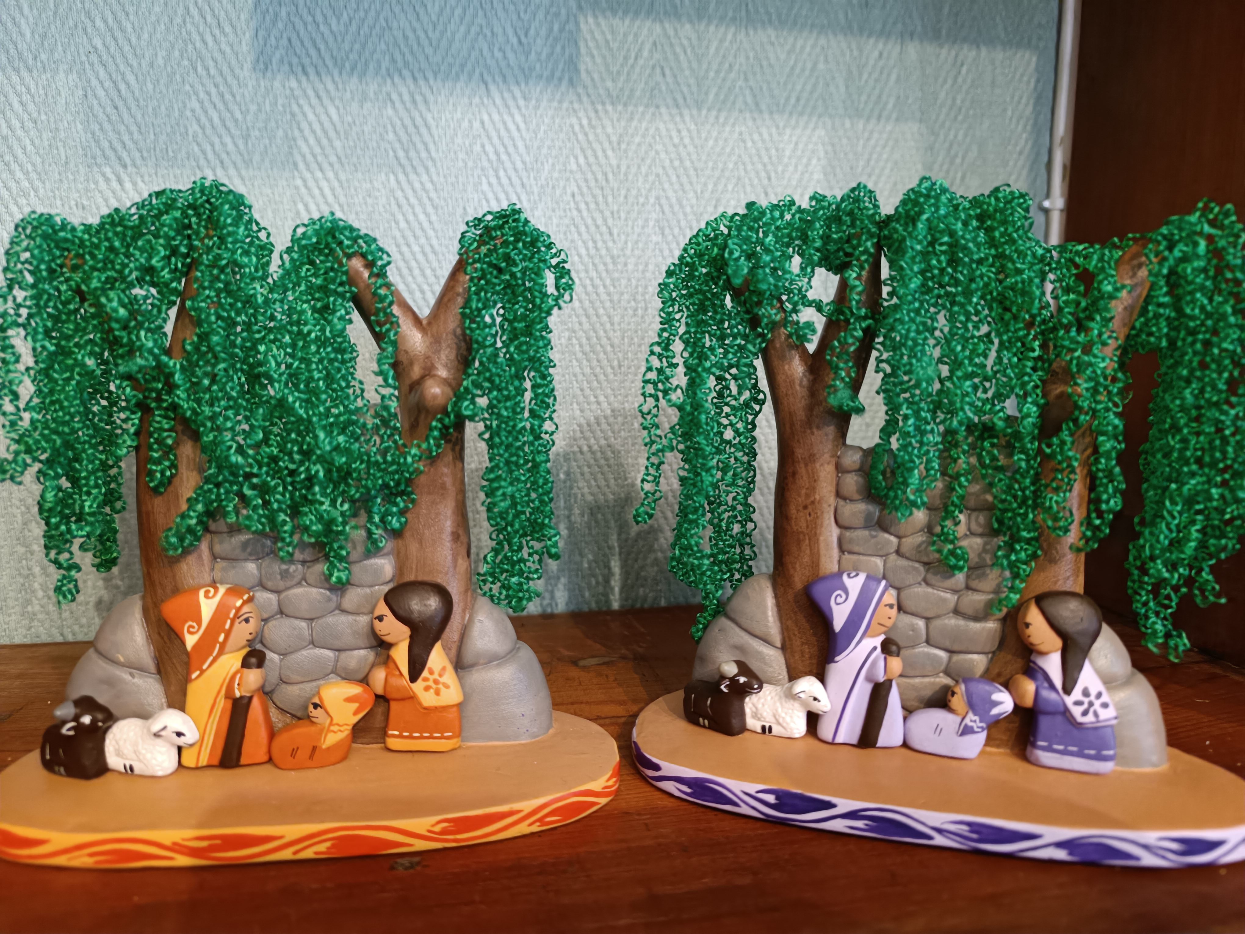 Nativité péruvienne sous les arbres en terre cuite couleur de 14cm