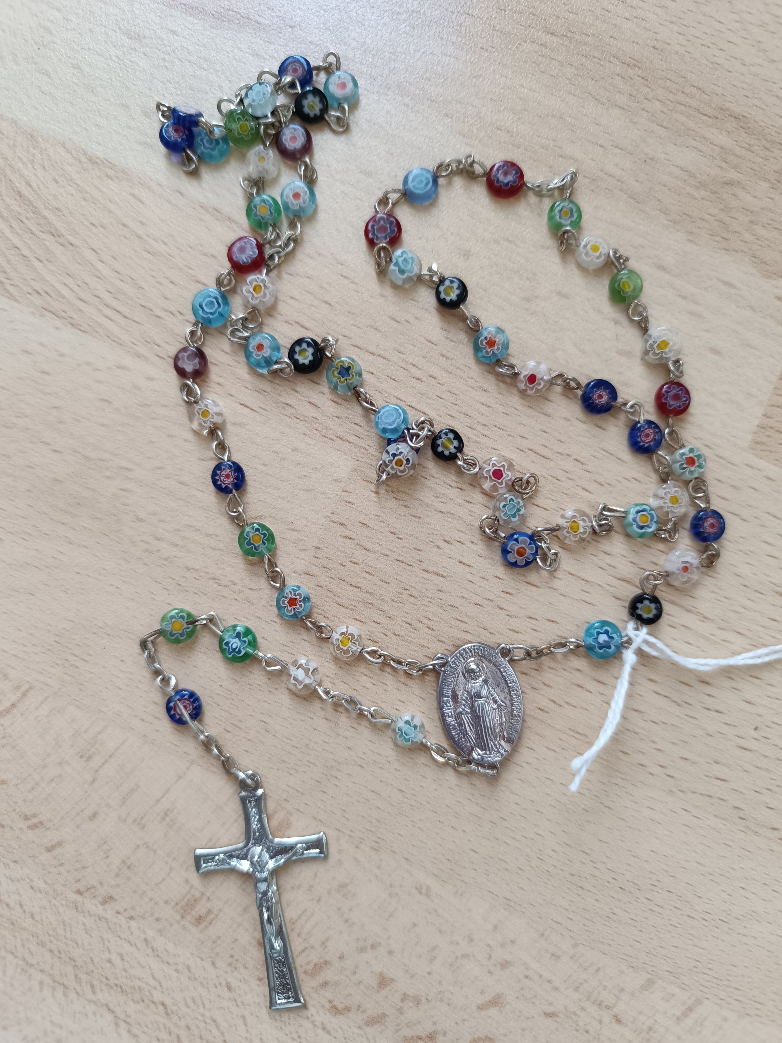 Chapelet métal avec grains plastiques de 6mm en forme de fleurs multicolores. Coeur Médaille de la Vierge miraculeuse et croix métal argentée avec Christ. Lg 36+16 Quantité : 3 |