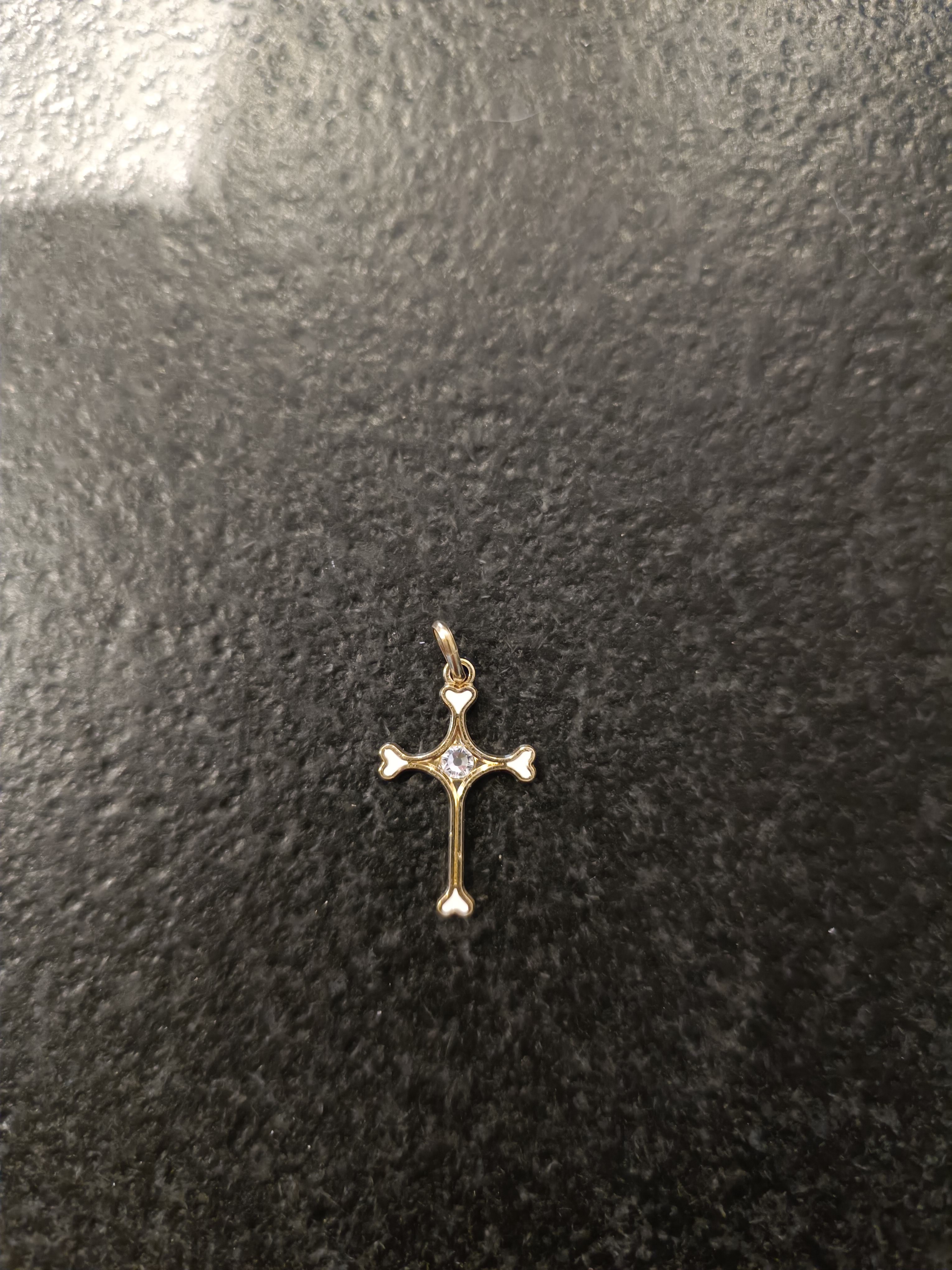 Croix en métal argenté avec les extrémités en forme de coeur, inclusion résine blanche et strass au coeur 2,2cm Quantité : 4 |