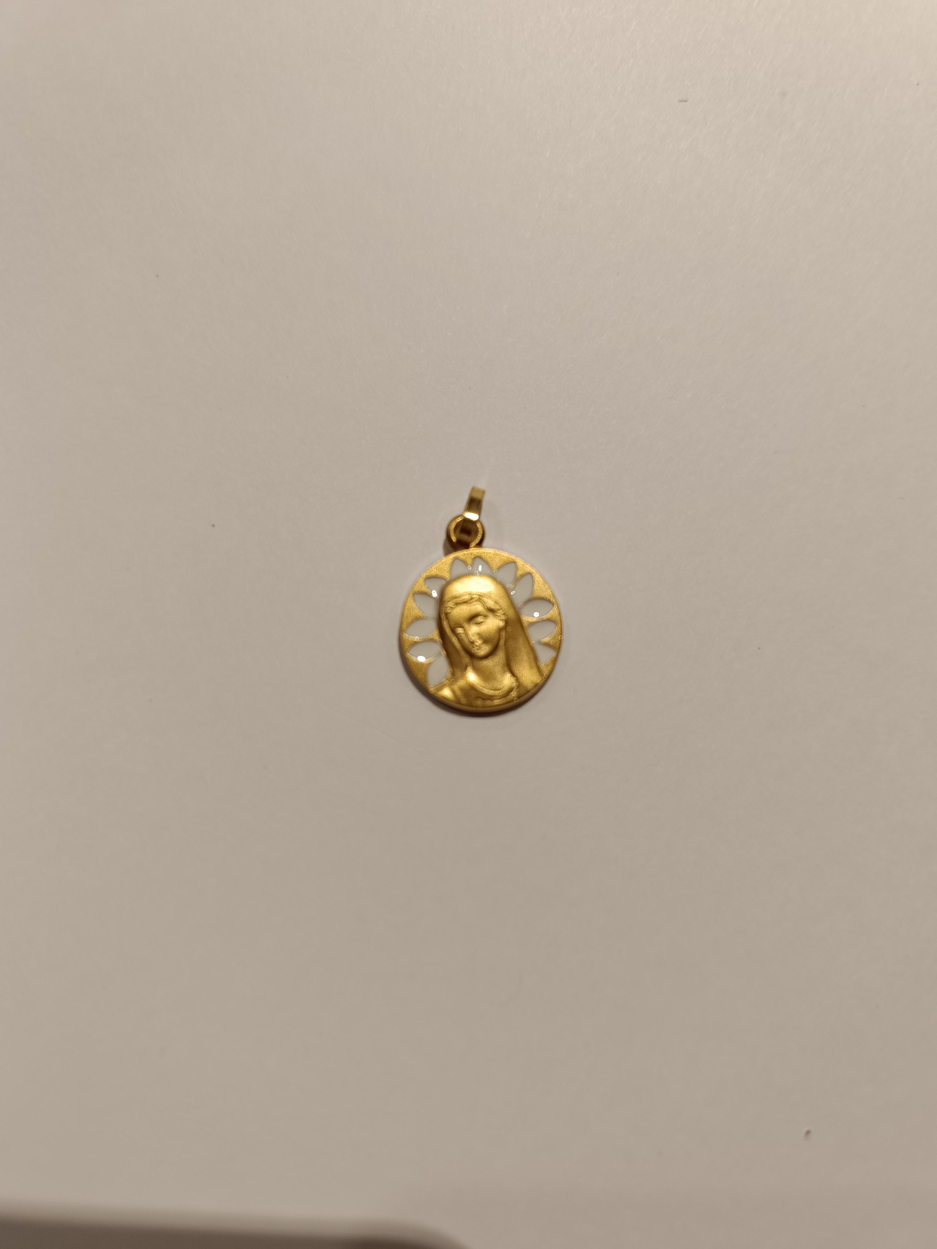 Médaille en métal adoré de la vierge en relief avec pétales émaillées blancs Diam 1,6cm Quantité : 3 |