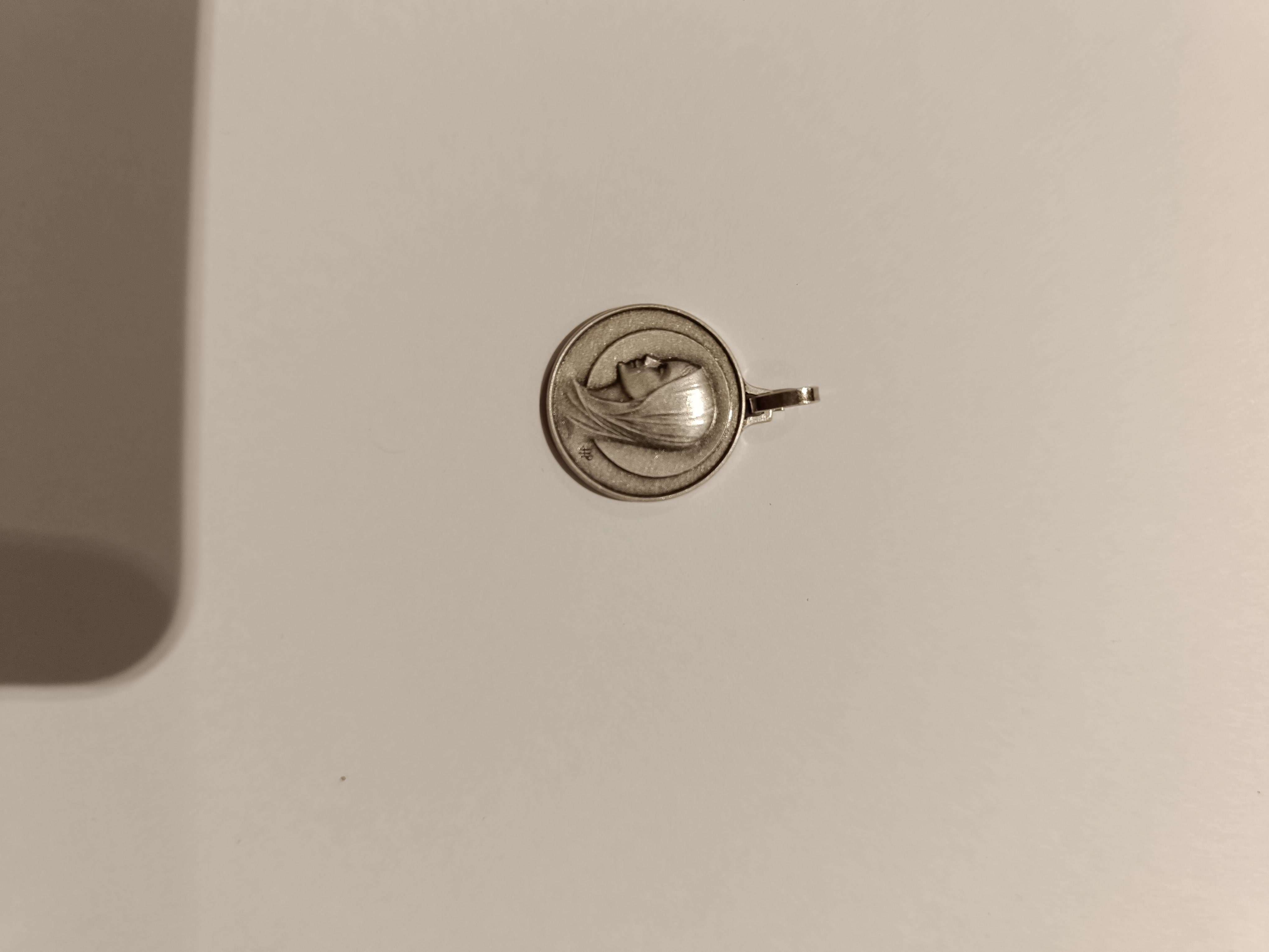 Médaille en métal argentée de la vierge en relief Diam 1,6cm