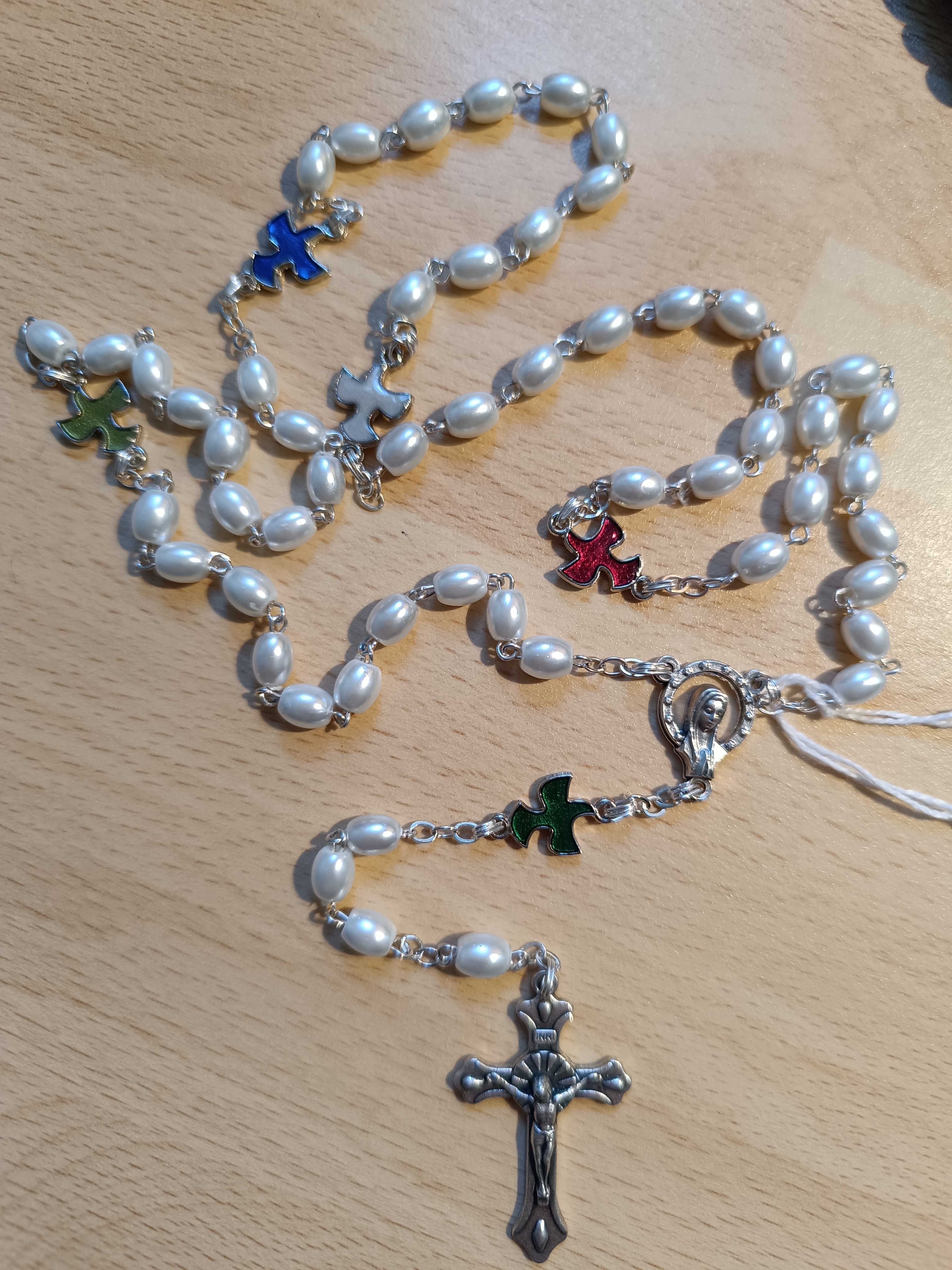 Chapelet métal avec grains ovoïdes de 5mm en plastique blanc nacré et Pater en colombe métal avec inclusion multicolore. Coeur avec Vierge et Croix en métal argenté avec Christ. Lg 36+16 cm Quantité : 1 |