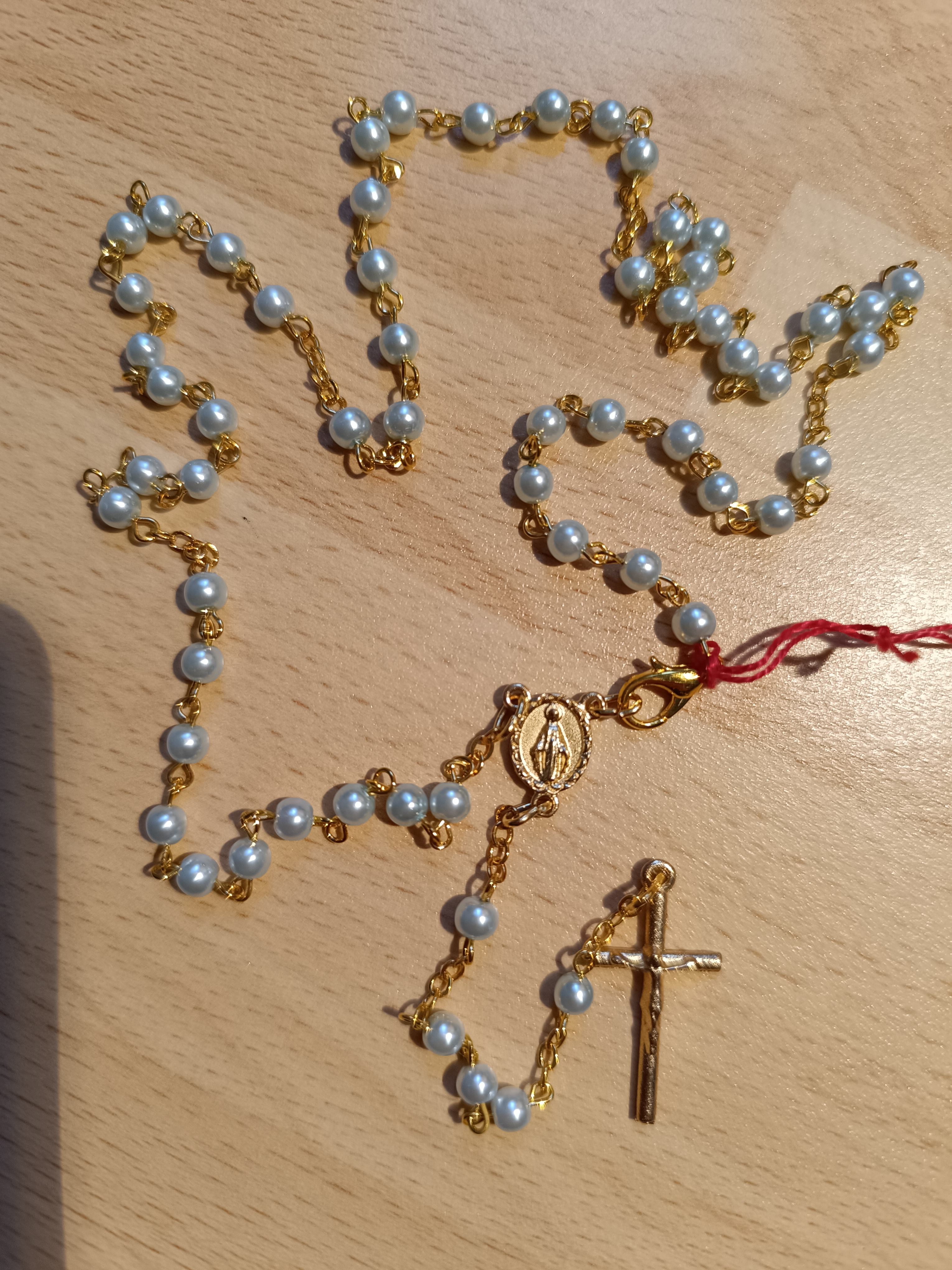 Chapelet en métal doré avec grains de 4mm en plastique bleu clair nacré. Coeur avec Vierge et Croix avec Christ en métal doré. Lg 28+12 cm avec fermoir. Quantité : 0 |