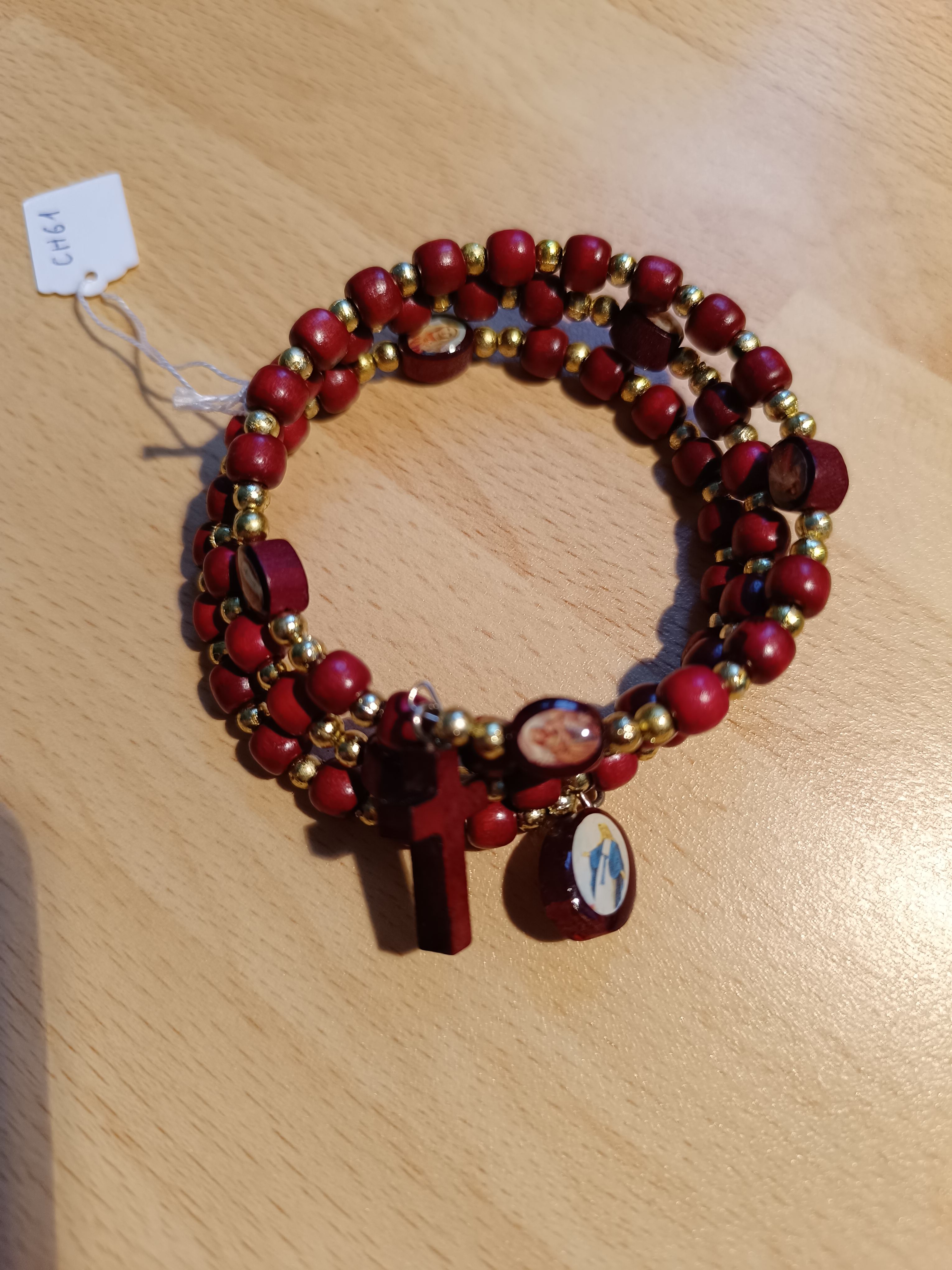 Bracelet ressort Chapelet avec grains de 6mm en bois rouge avec Pater bois et inclusion résines Sacré-Coeur et vierges. Croix en bois rouge. Quantité : 7 |