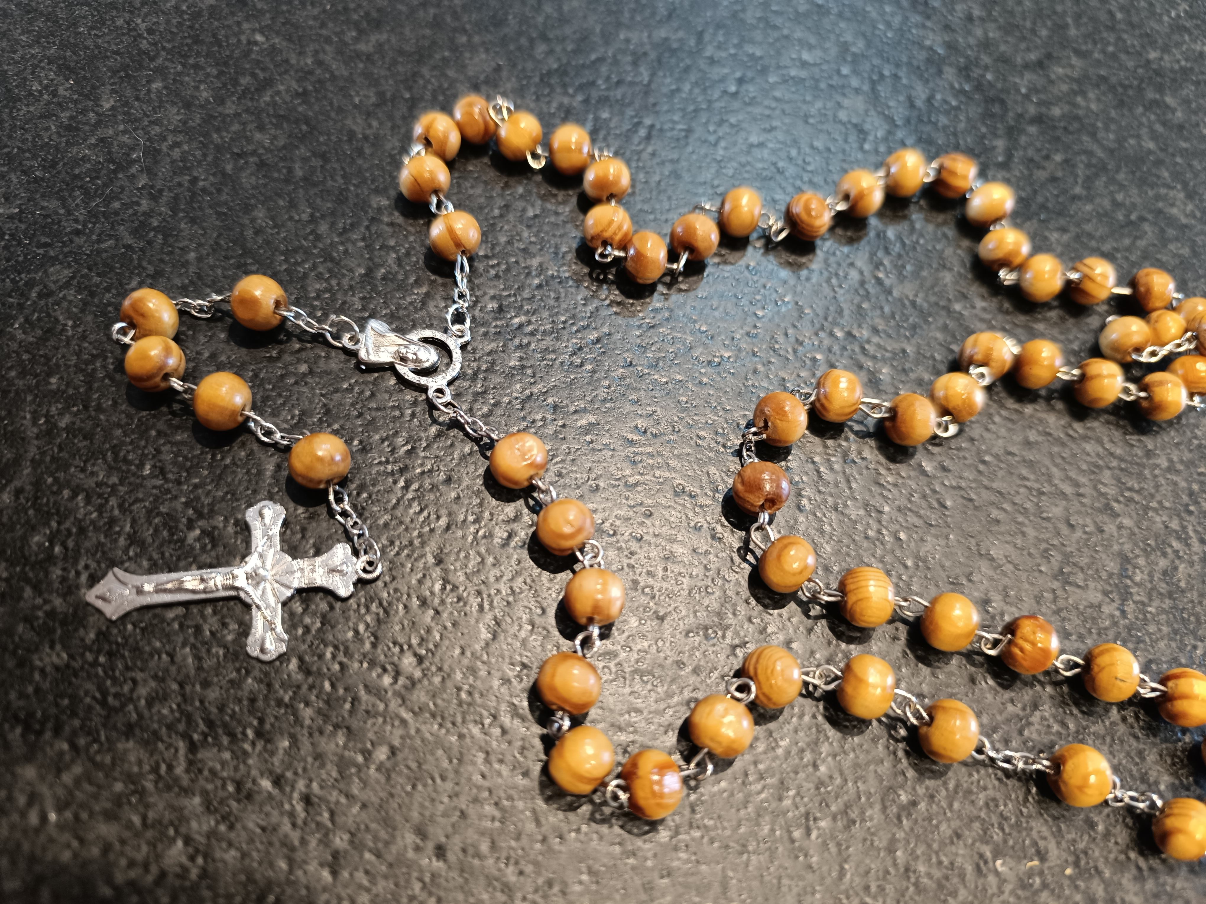 Chapelet méral avec grains de 7mm en bois vernis. Coeur avec Vierge et croix avec Christ en métal argenté. Lg 37+15 cm Quantité : 1 |