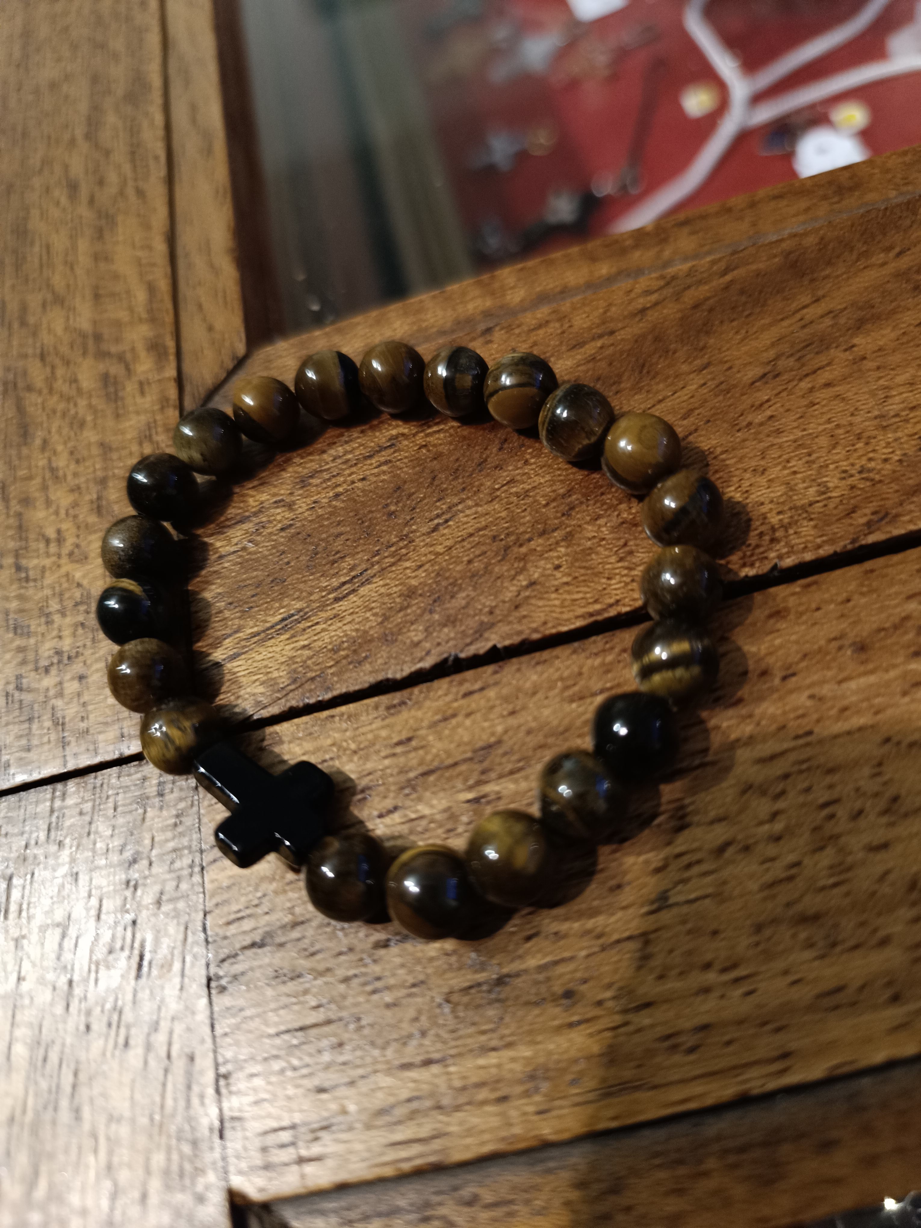 Bracelet élastique avec grains en pierre naturelle (Oeil de tigre) et croix noire en hématite Quantité : 0 |