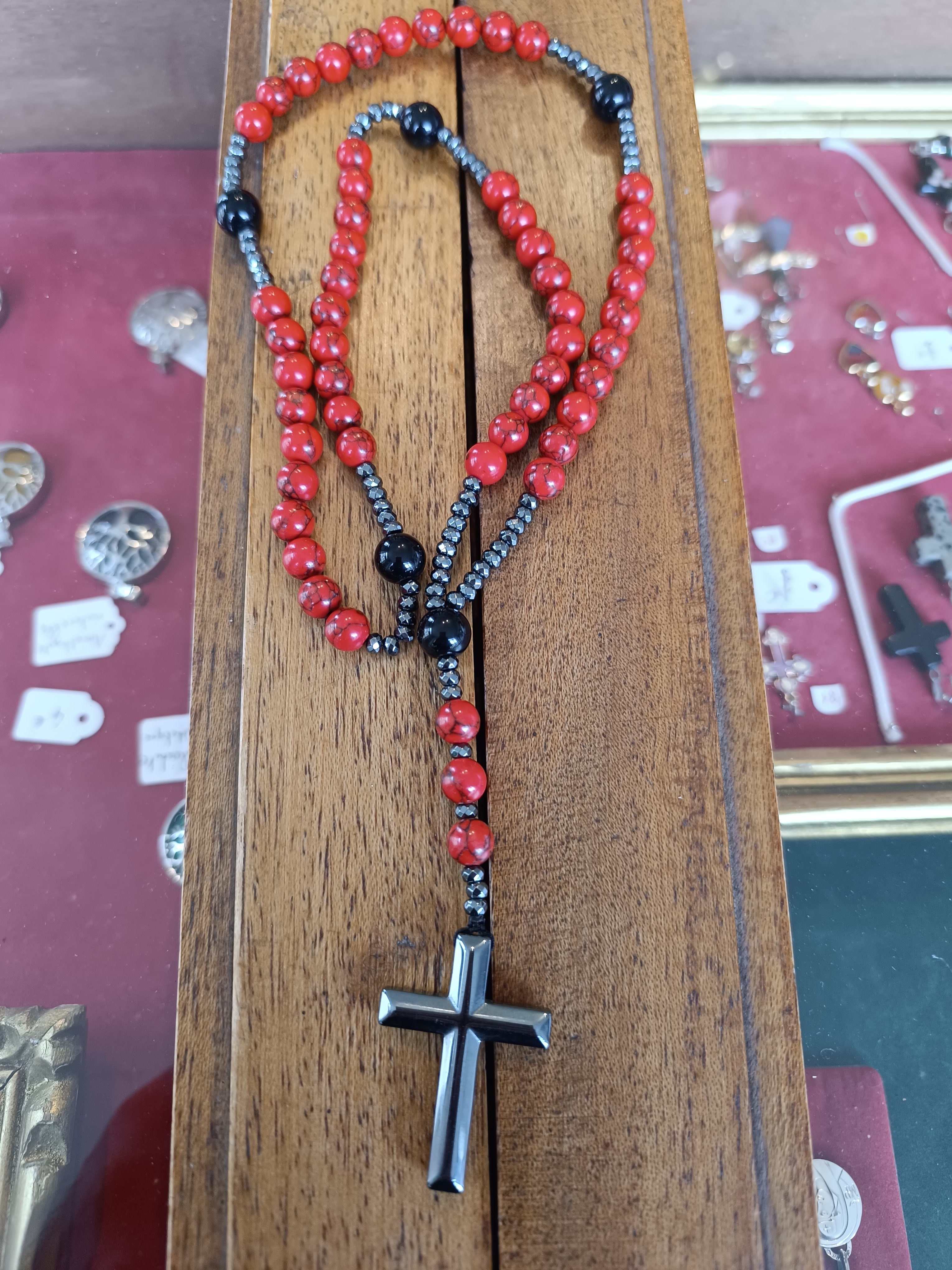 Chapelet avec grains de 8mm en pierre rouge Pater et coeur en pierre noire et croix en hématite. Lg 36+15 cm. Quantité : 1 |
