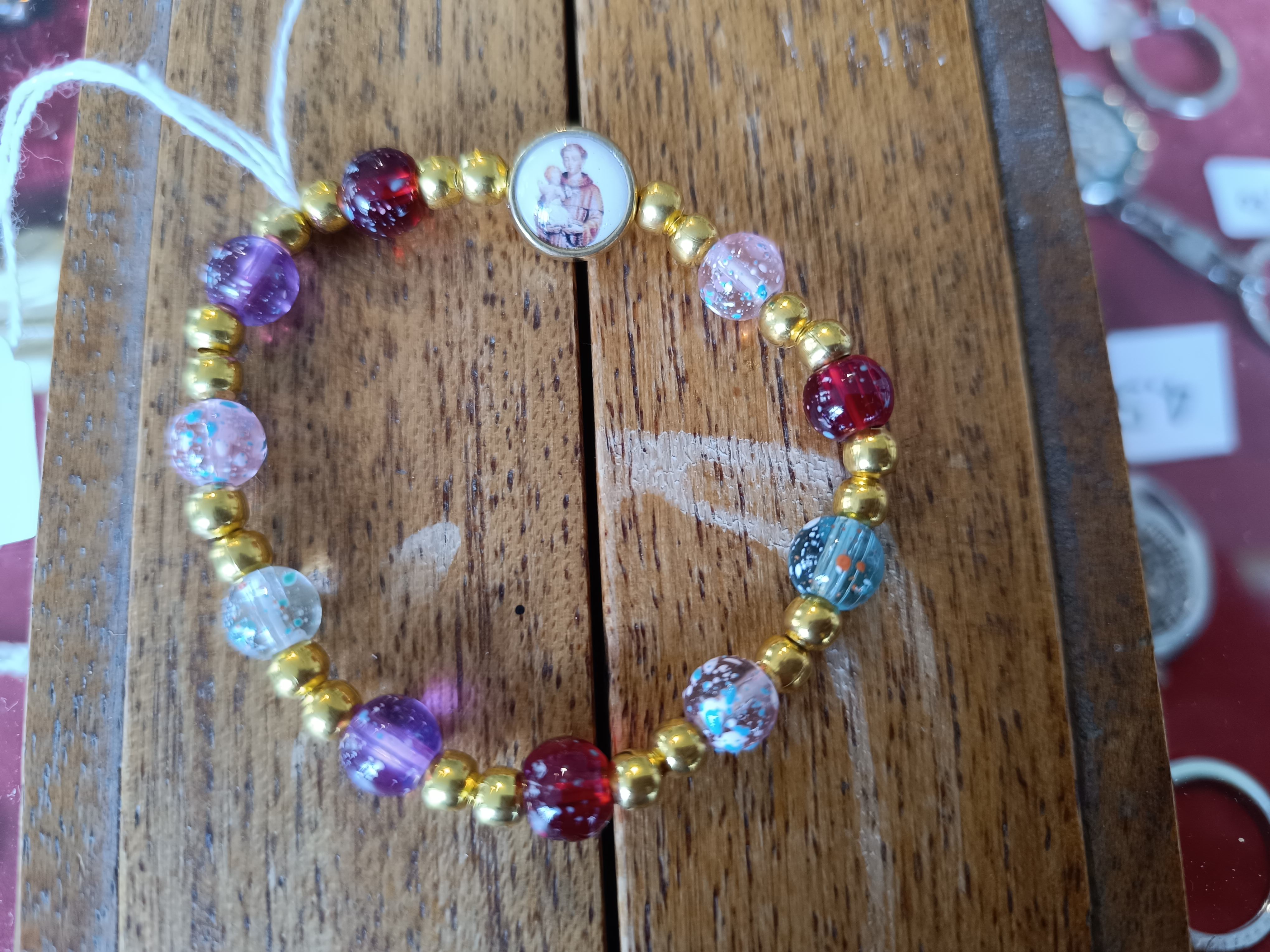 Dizainier bracelet élastique avec grains en plastique multicolores pailletées et grains dorés. Résine avec Saint Antoine Quantité : 3 |