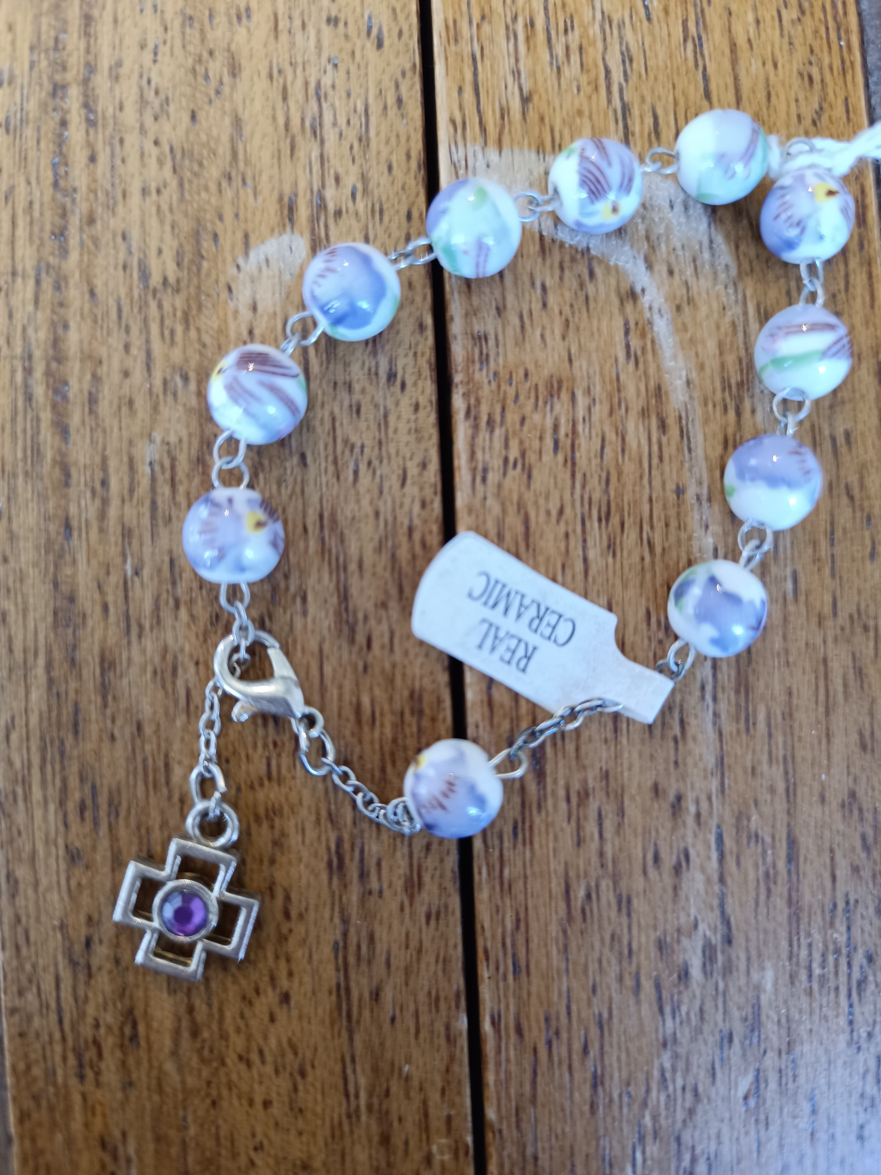 Dizainier bracelet metal avec grains en céramique blanche avec fleurs violettes. Croix metal argenté Quantité : 3 |