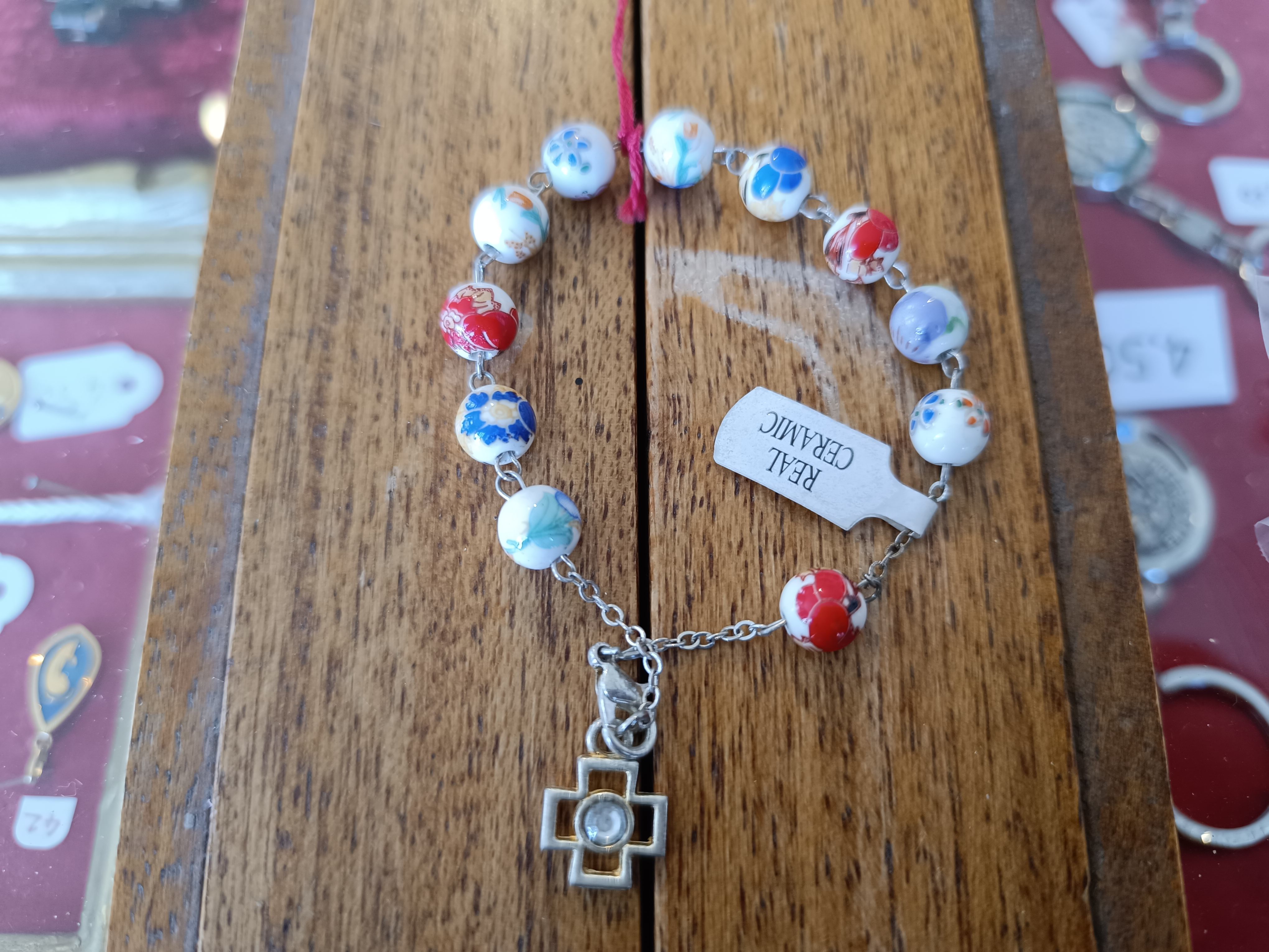 Dizainier bracelet metal avec grains en céramique blanche avec fleurs rouges et bleus. Croix metal argenté Quantité : 1 |