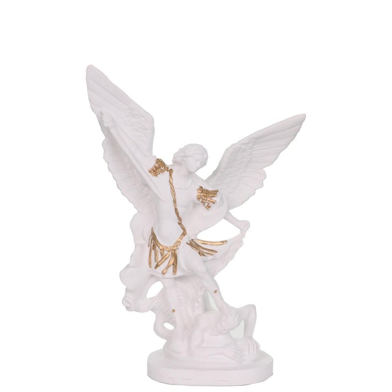 Statue en résine et poudre de marbre blanc avec des touches dorée de St Michel. H 20 cm. Quantité : 1 |
