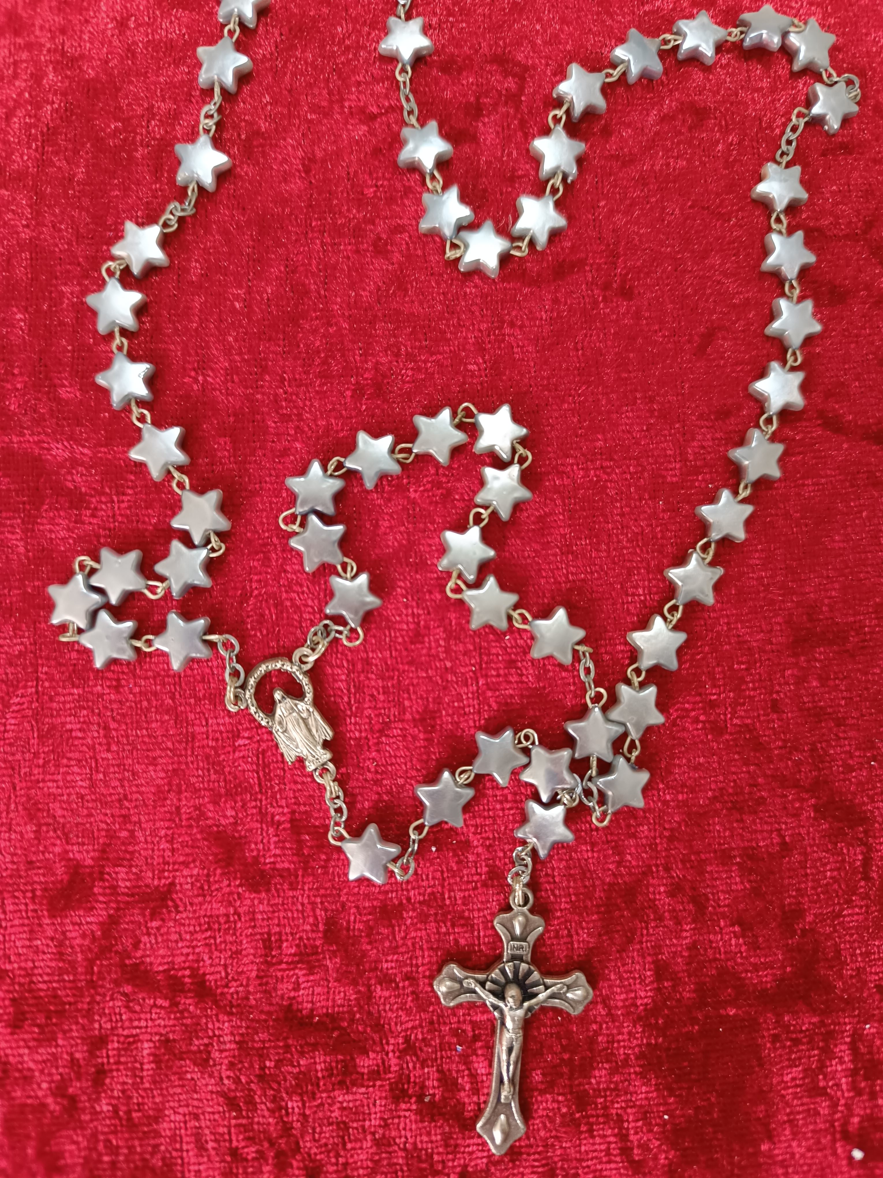 Chapelet métal avec grains plastique bleu gris en forme d'étoile 8mm. Coeur avec vierge miraculeuse et Croix métal avec Christ. Lg 33+15 Quantité : 1 |