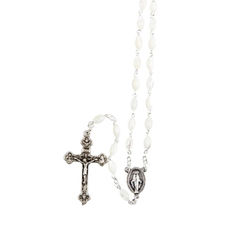 Chapelet grains nacre ovales 8mm Chaine couleur argentée Lg au cœur 35cm Croix avec Christ Quantité : 2 |