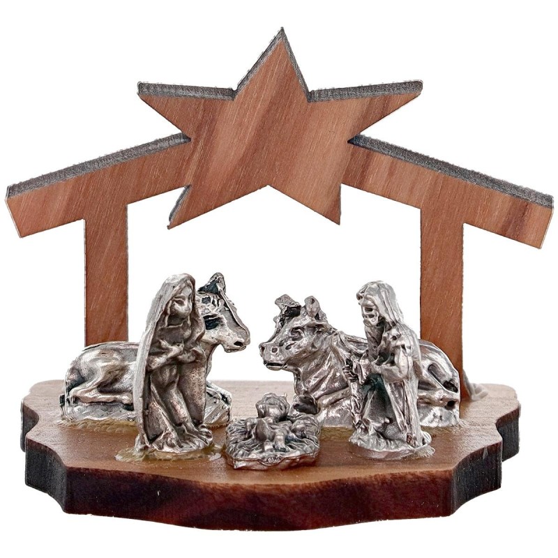 Nativité bois d'olivier et personnages métal 4cm (NO13)