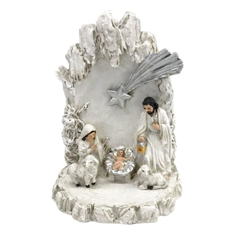 Nativité en résine imitation bois beige et argentée H. 12 cm