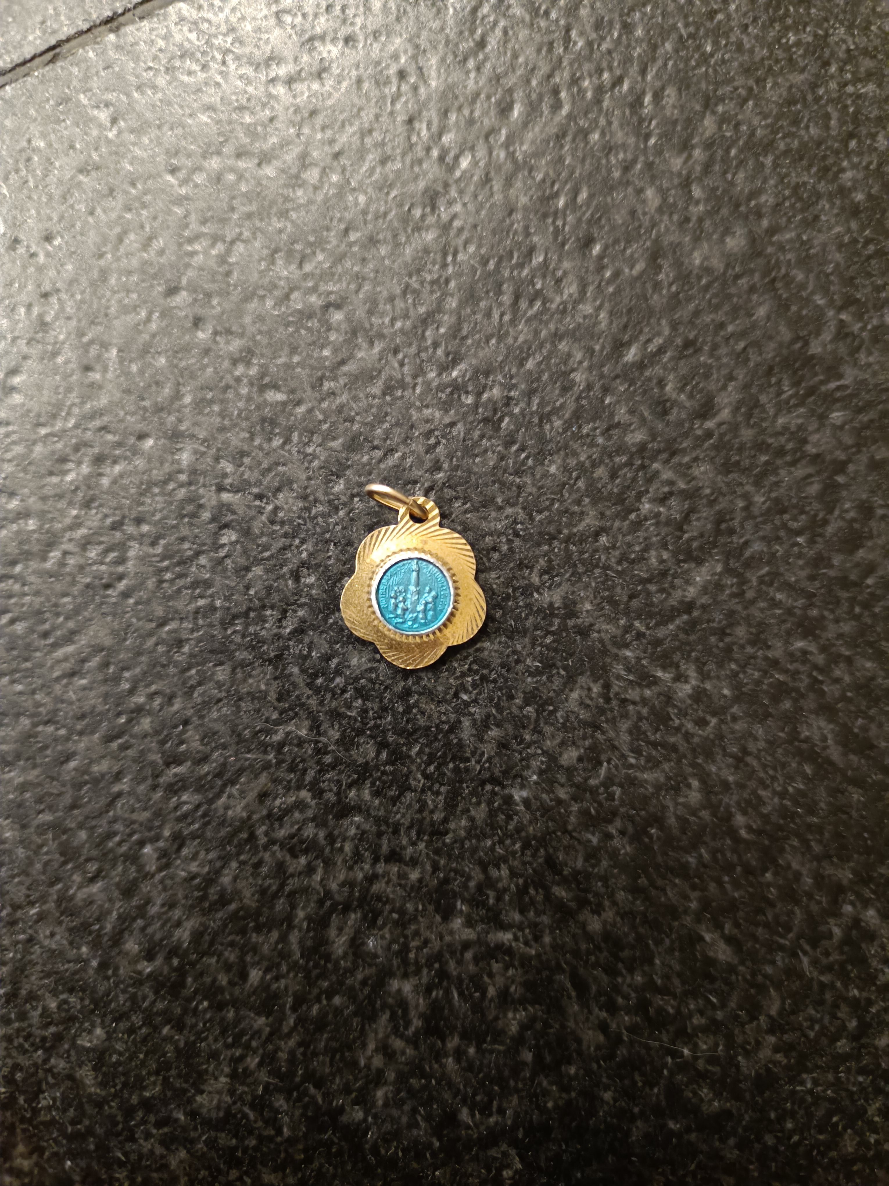 Médaille métal doré en forme de fleur émaillée bleu Neuvizy