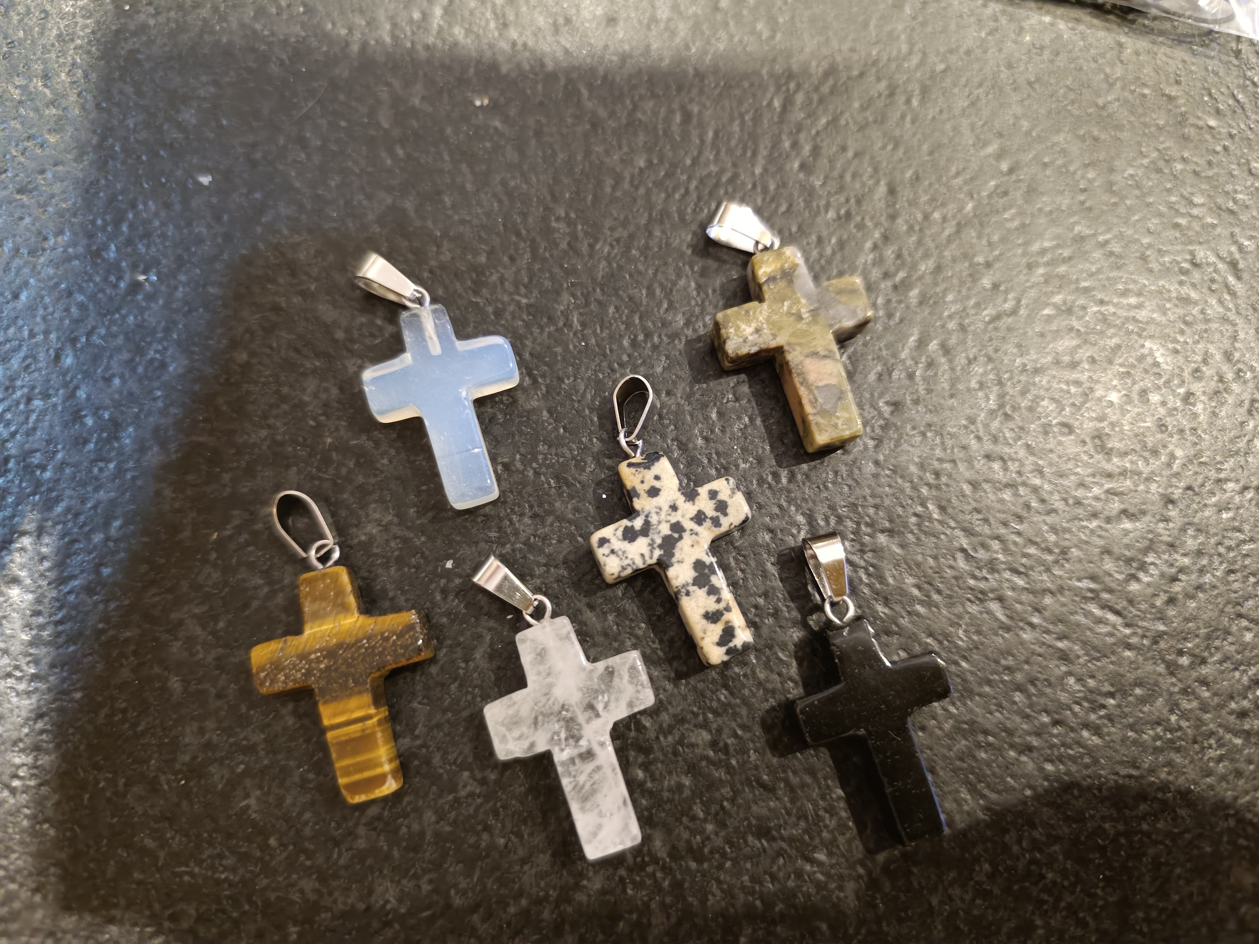 Pendentif en forme de Croix en pierre naturelle 2,6cm. Œil de tigre, Opale, Unakite, Jaspe léopard, Cristal de roche et Obsidienne Quantité : 12 |