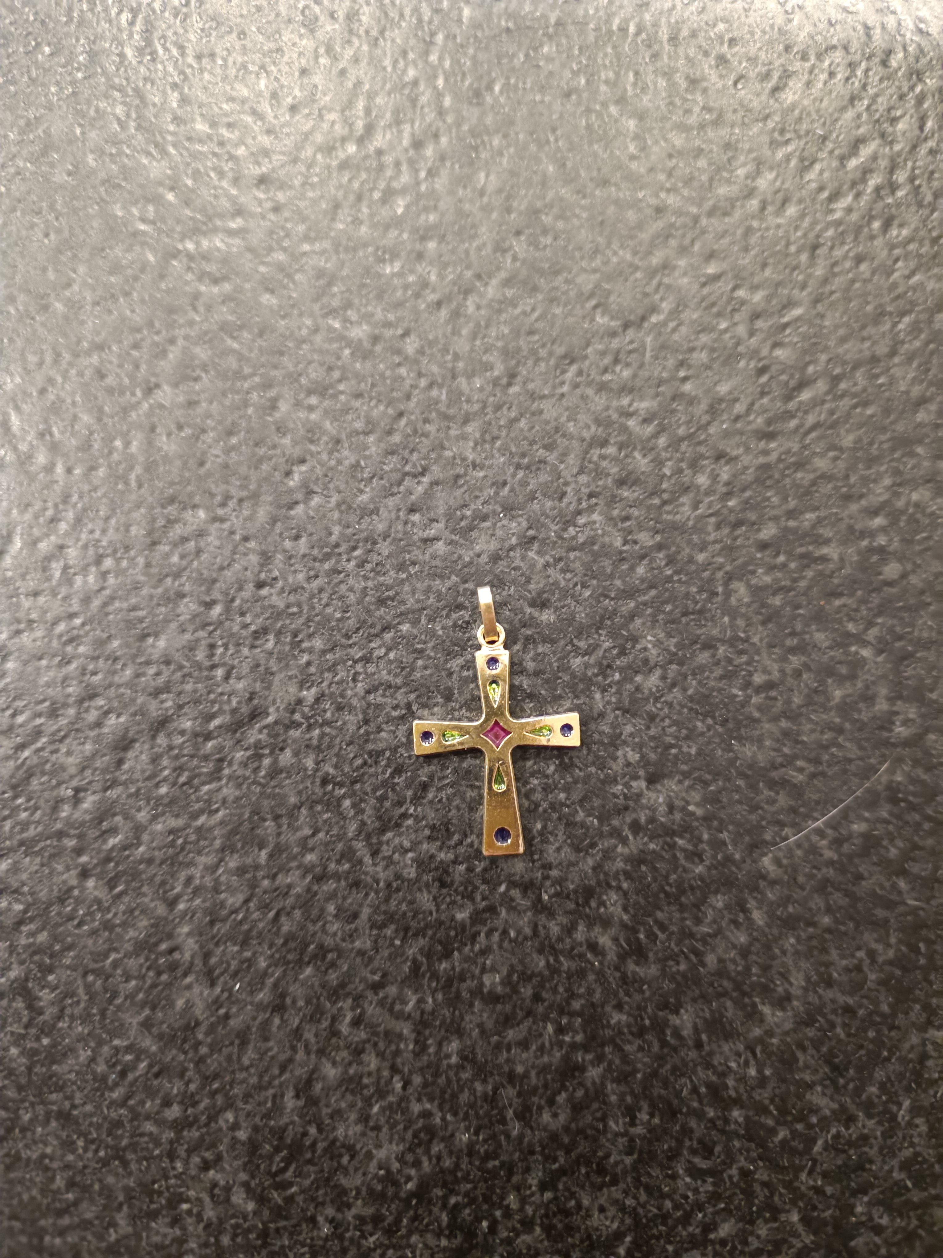 Croix en métal doré avec inclusions en strass rouge, vert et bleu