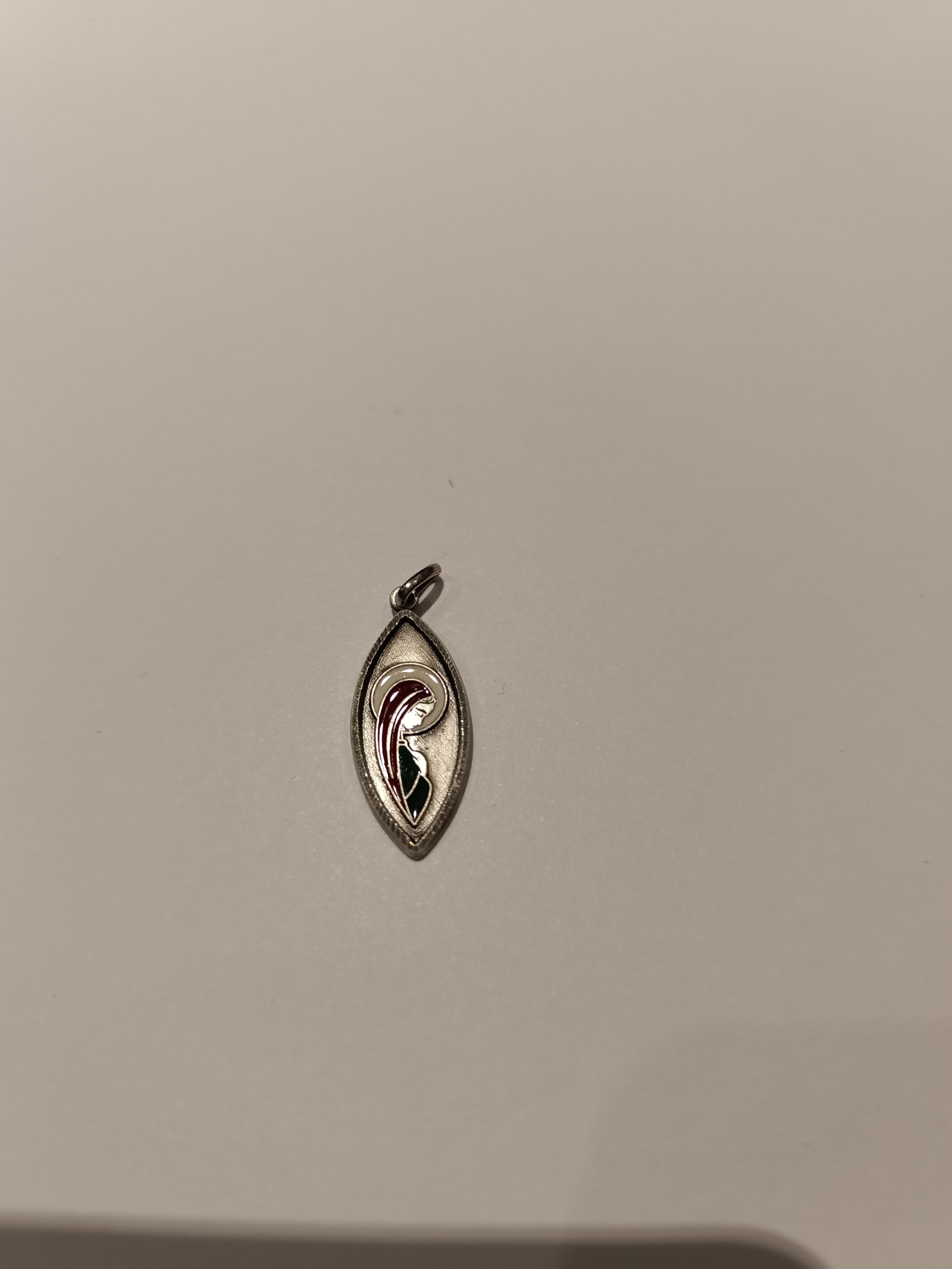Pendentif en métal argenté ovale pointu Vierge en relief avec inclusion de résine rouge et verte 2,4cm Quantité : 25 |