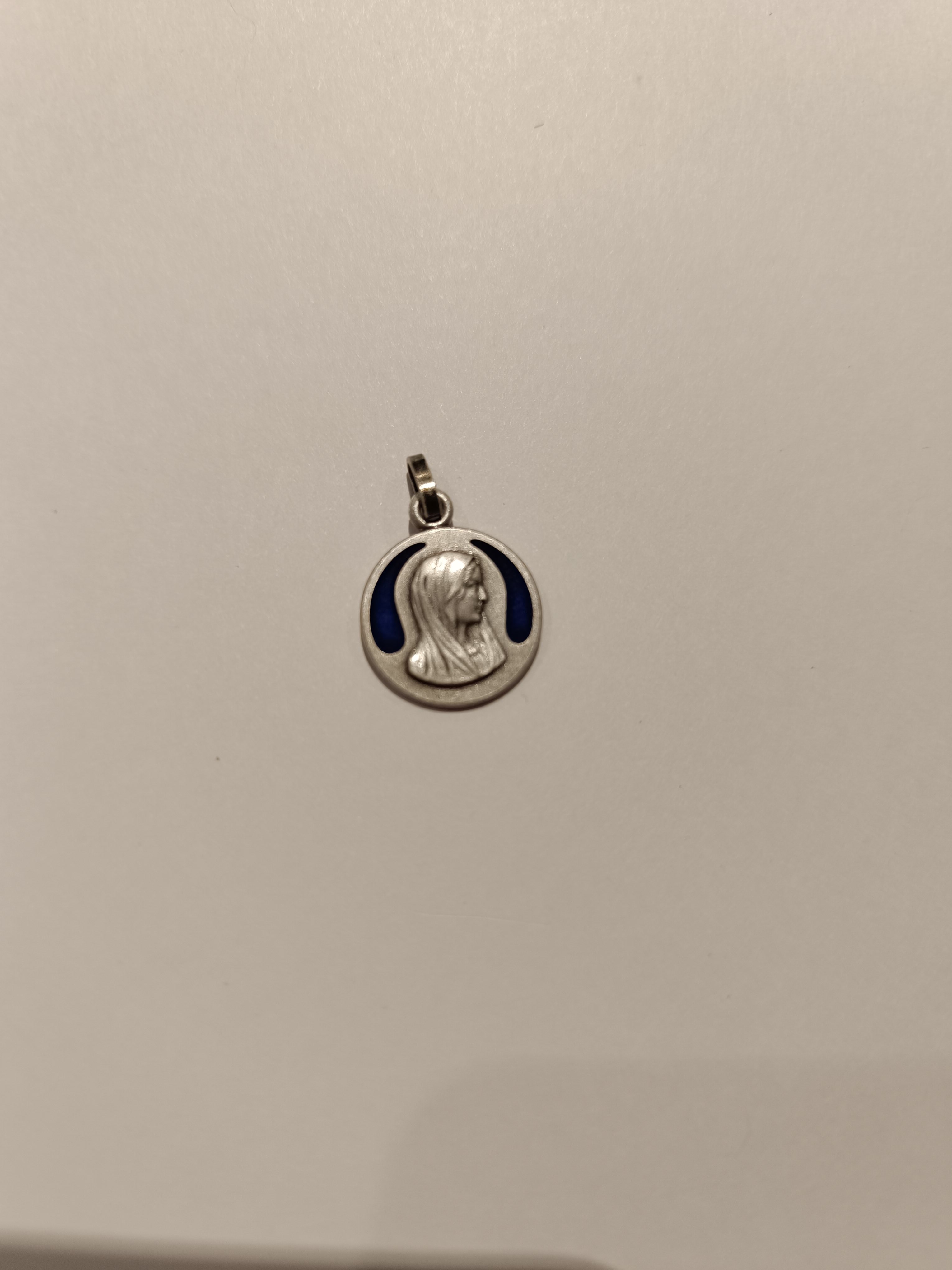 Médaille en métal argenté de la vierge en relief avec deux virgules émaillées bleues Diam 1,6cm Quantité : 5 |