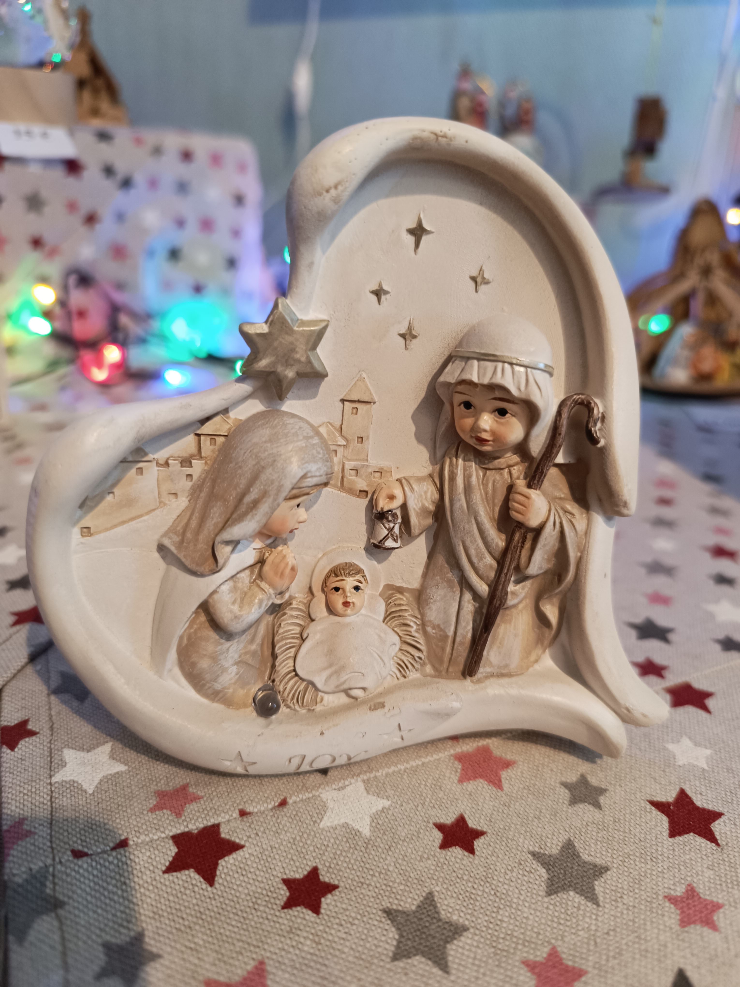 Nativité en plâtre dans coeur en forme d'aile d'ange