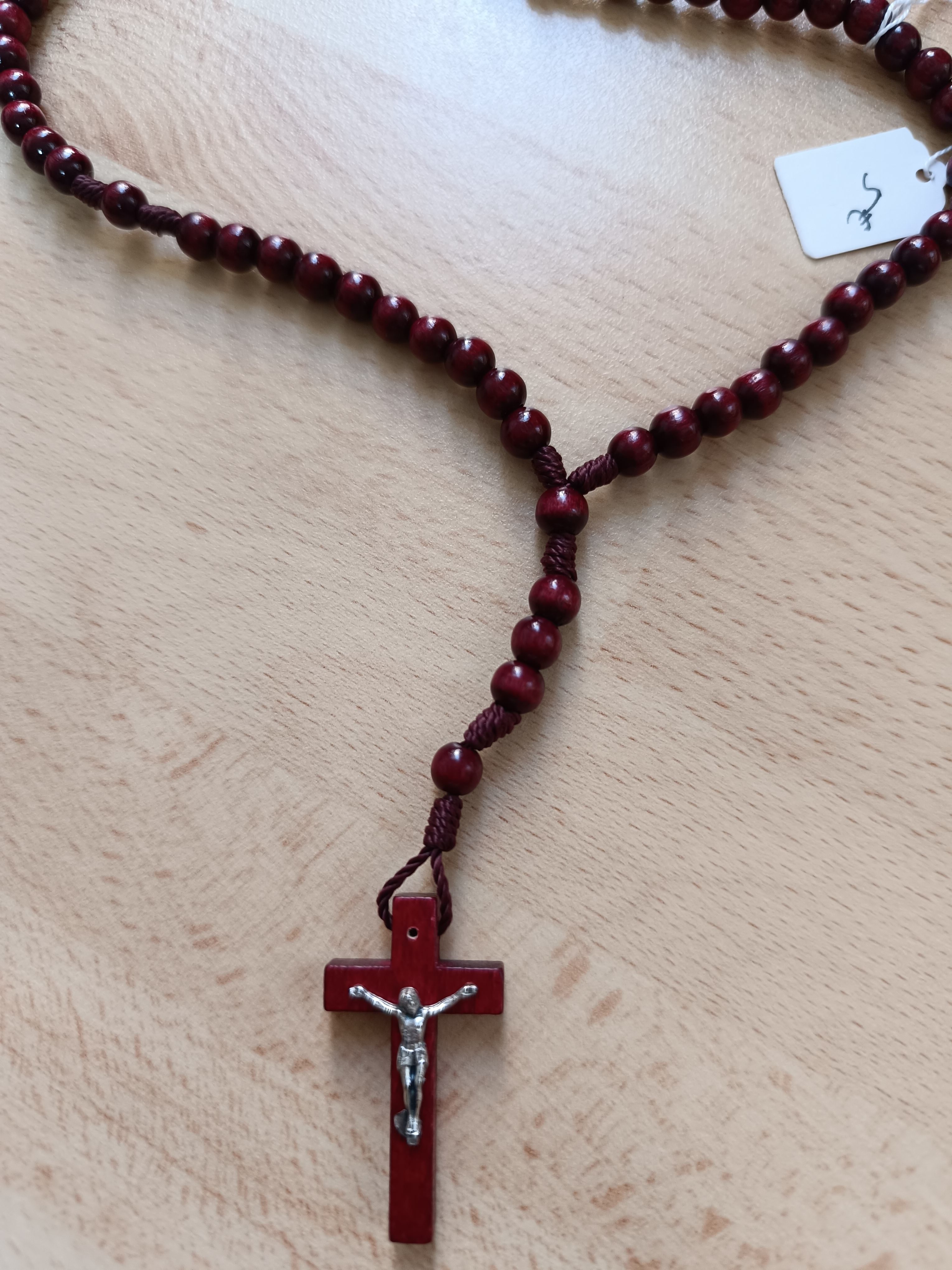 Chapelet avec grains bois rouge 5mm sans coeur avec Christ en métal argenté sur croix en bois rouge. Lg 17+9 Quantité : 3 |