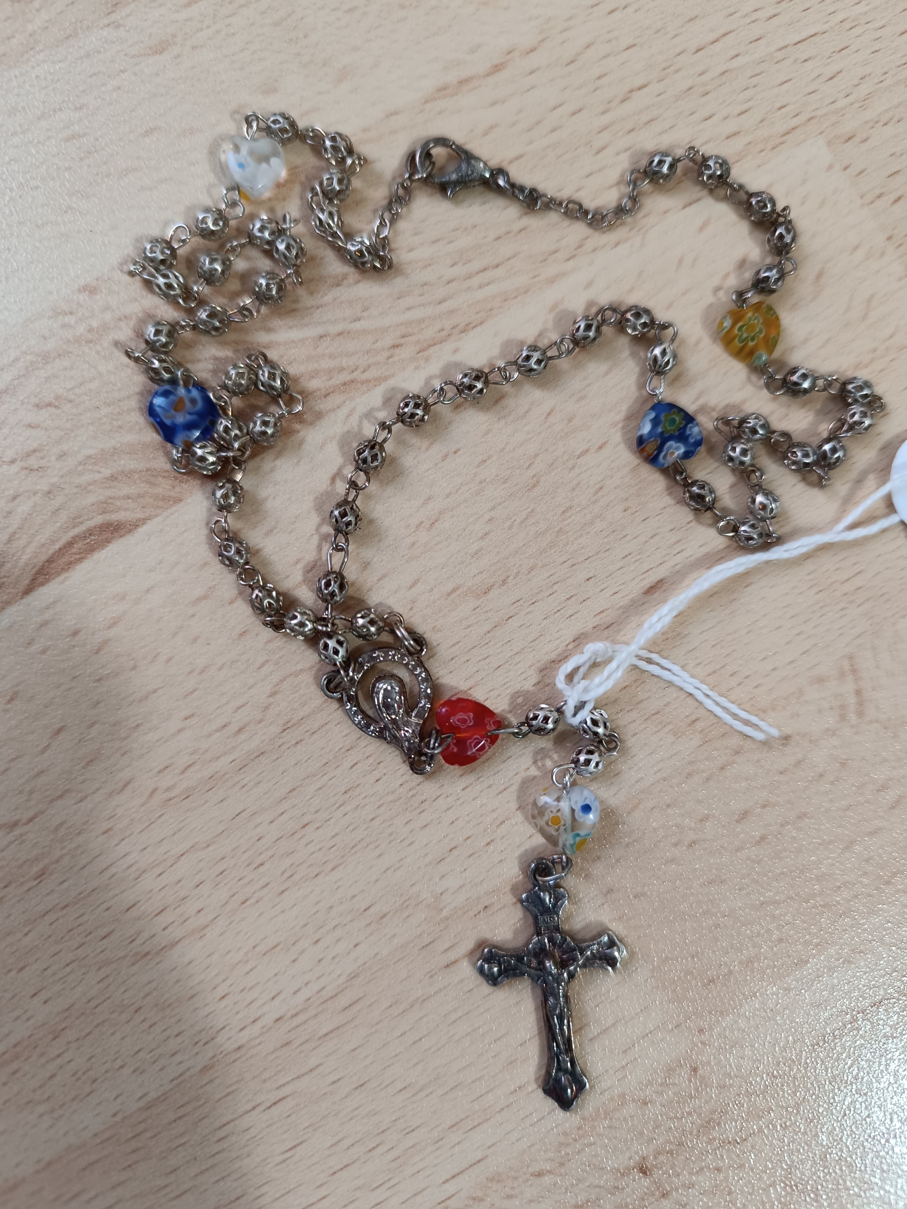 Chapelet métal avec grains en dentelle 4mm, Pater en plastique de couleur en forme de coeur. Coeur avec Vierge couronnée d'étoiles et Croix en métal argenté avec Christ. Lg 25+10 cm avec fermoir. Quantité : 2 |