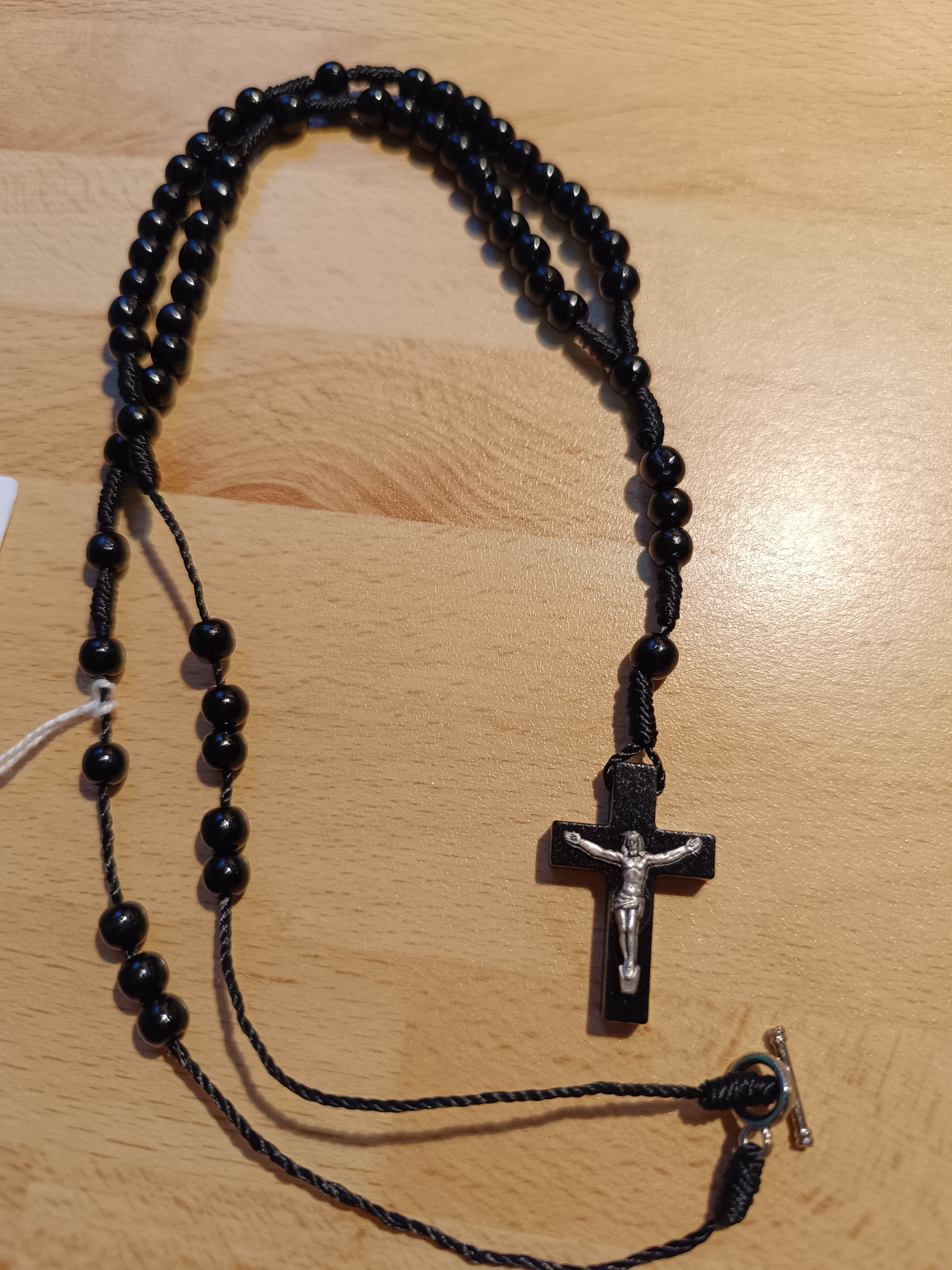 Chapelet avec grains en bois noir de 6mm, sans coeur avec Christ en métal argenté sur croix en bois noir. Lg 31+9 cm avec fermoir Quantité : 2 |