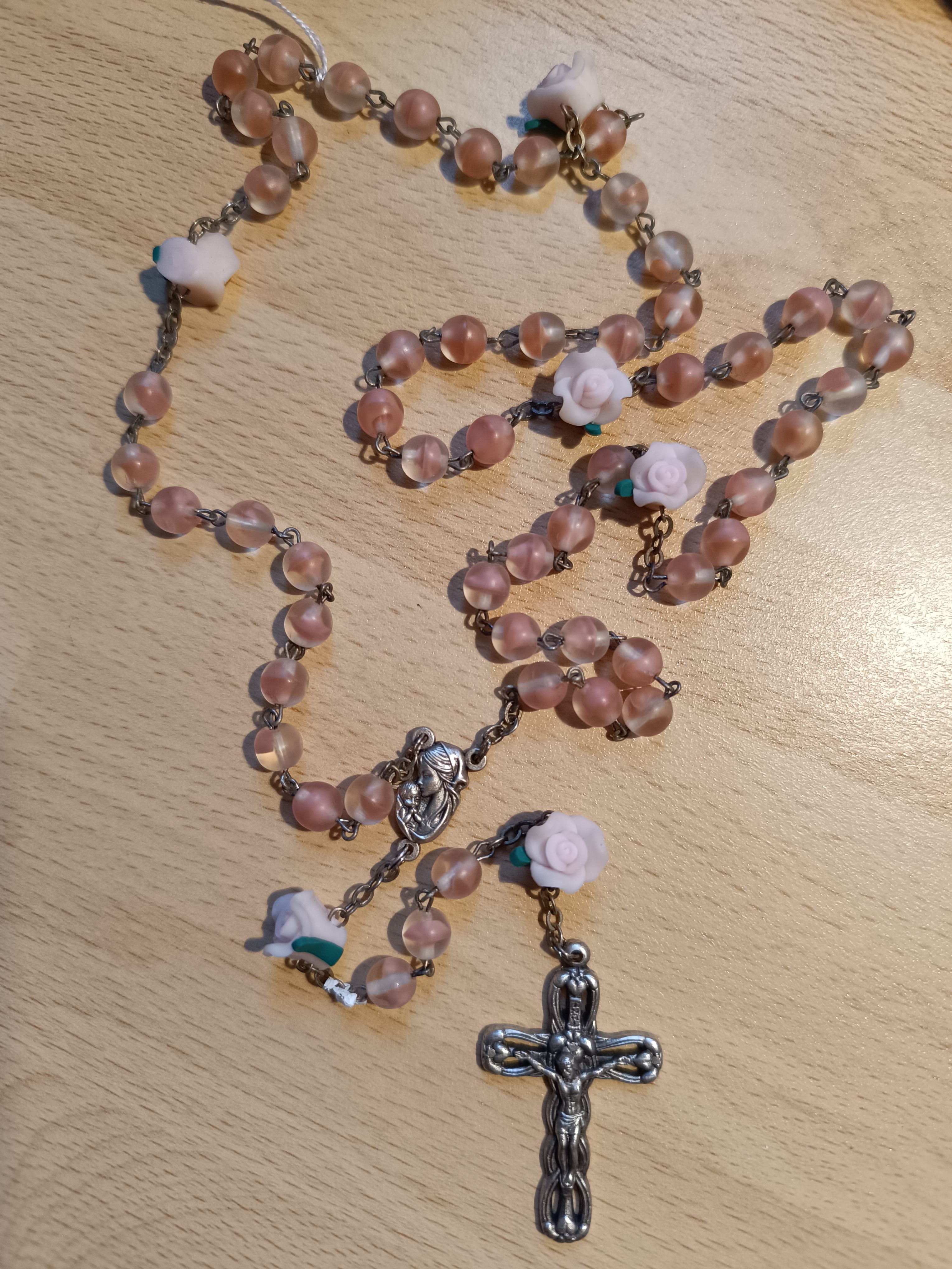 Chapelet métal et plastique rose laiteux avec Roses (CH56)