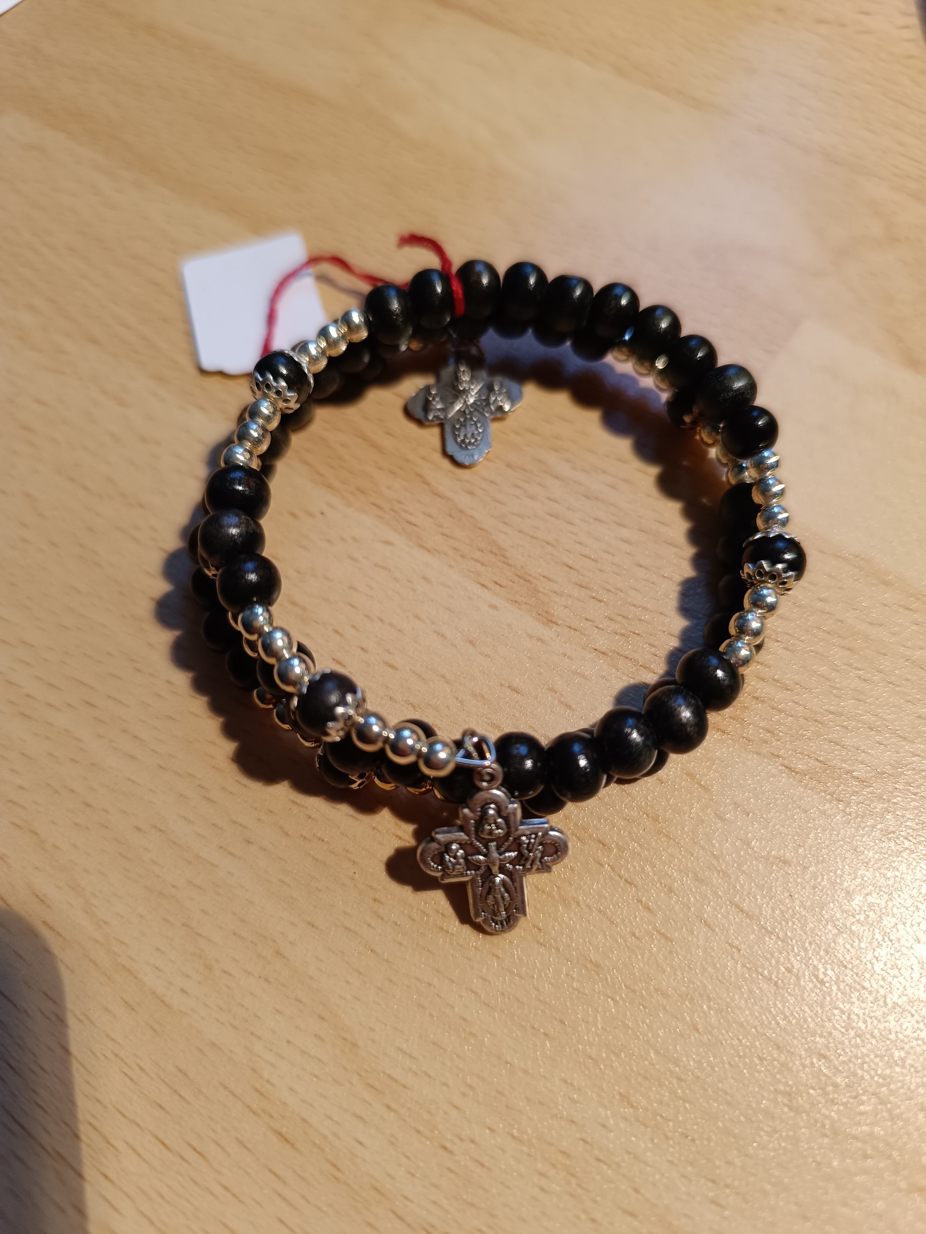Bracelet ressort Chapelet avec grains bois noir de 6mm. Croix en métal argenté aux extrémités Quantité : 1 |