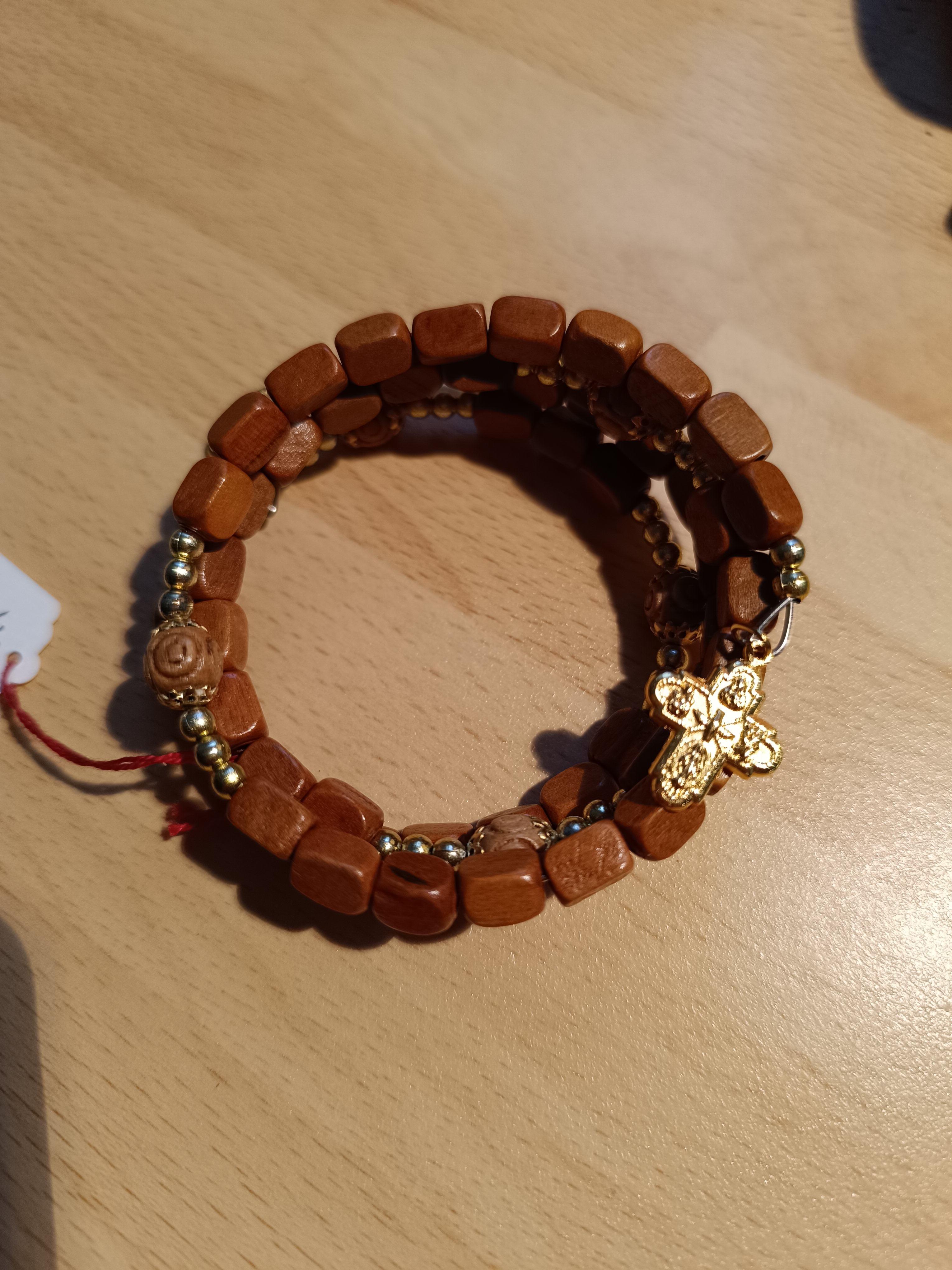 Bracelet ressort Chapelet avec grains bois vernis de 5mm de forme cubique. Pater en bois rond et Croix en métal doré aux extrémités Quantité : 0 |
