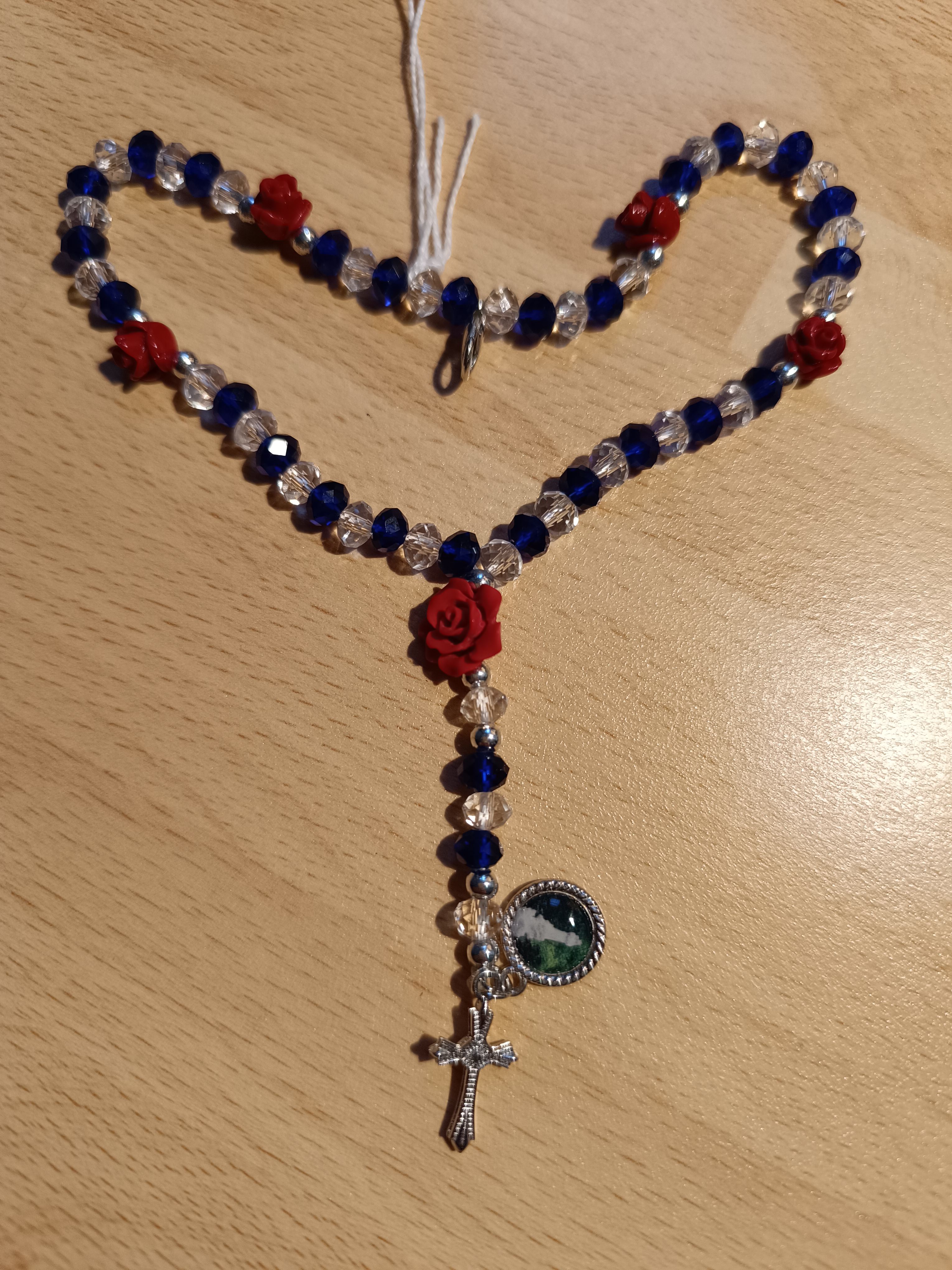 Petit chapelet fil et plastique transparent et bleu avec roses rouges (CH65)