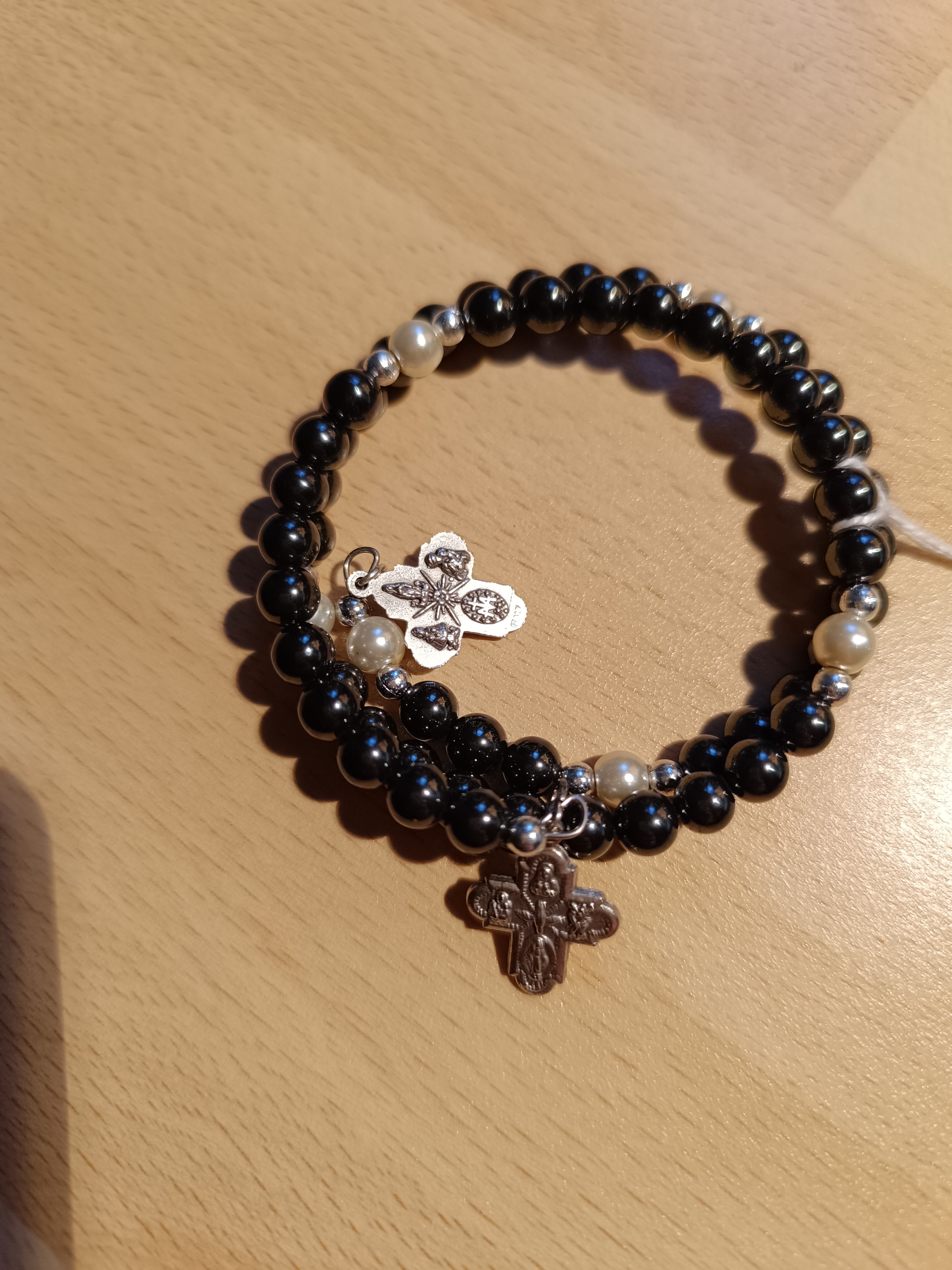 Bracelet ressort Chapelet avec grains de 6mm en hématite. Croix en métal argenté aux extrémités. Quantité : 1 |