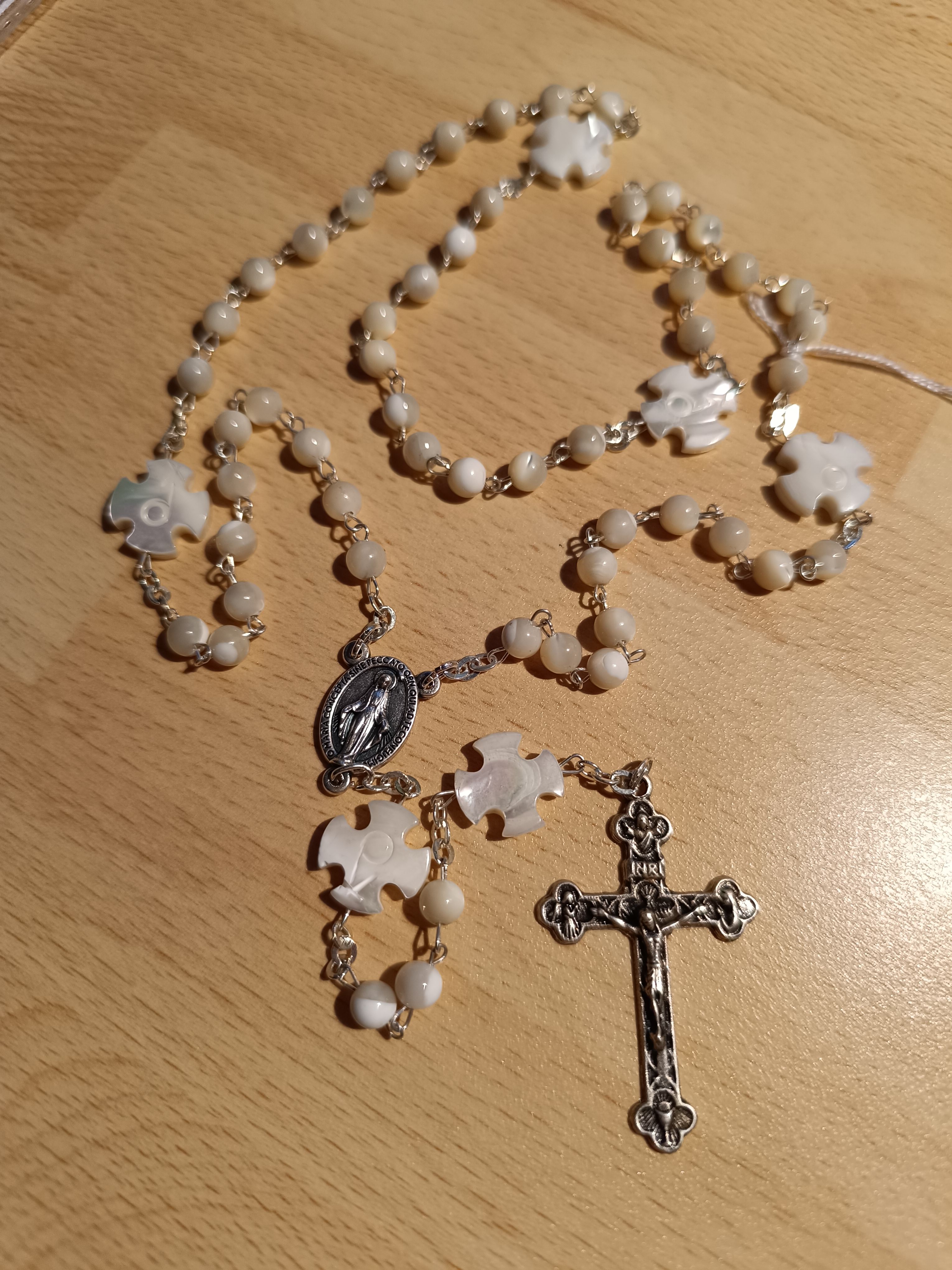 Chapelet métal avec grains de 5mm en nacre avec Pater en forme de croix en nacre. Coeur avec médaille de la Vierge miraculeuse et Croix avec Christ en métal argenté. Lg 33+17 cm Quantité : 1 |