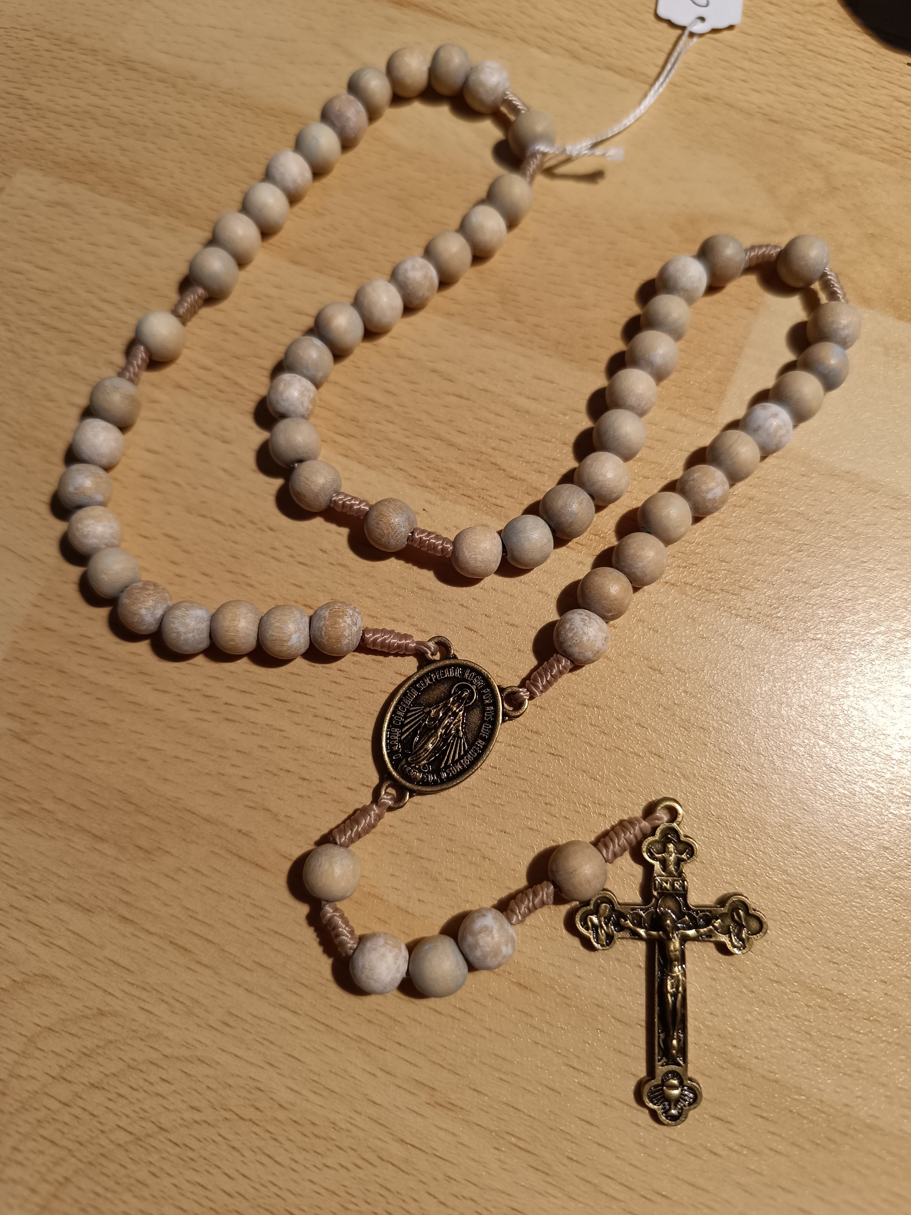 Chapelet avec grains en bois clair aspect délavé. Coeur avec médaille de la Vierge miraculeuse et Croix avec Christ en métal couleur bronze. Lg 23+14 cm Quantité : 1 |