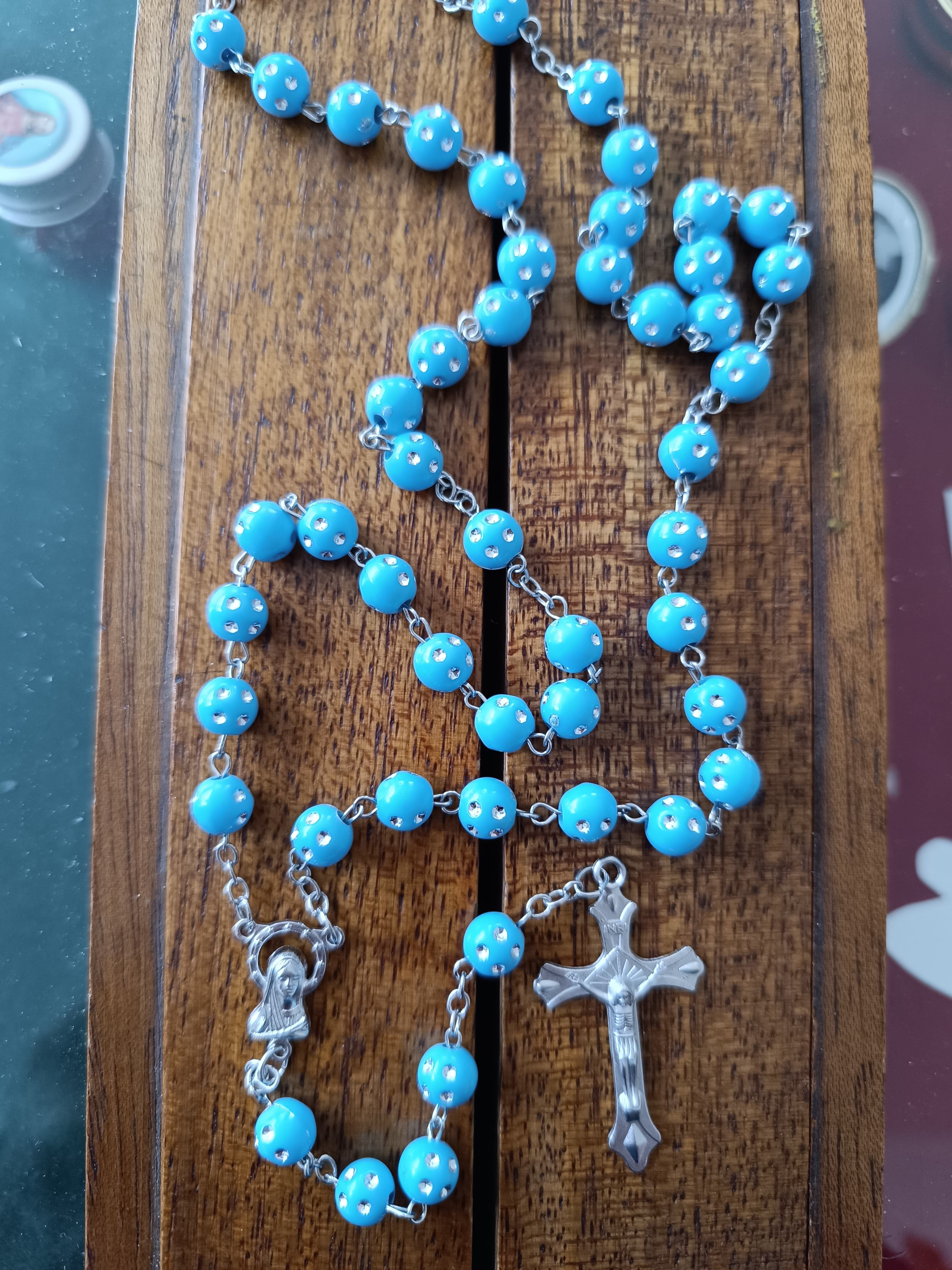 Chapelet métale avec grains de 8mm en plastique bleu ciel et points argentés. Coeur avec Vierge et Croix avec Christ en métal argenté. Lg 37+16 cm Quantité : 1 |