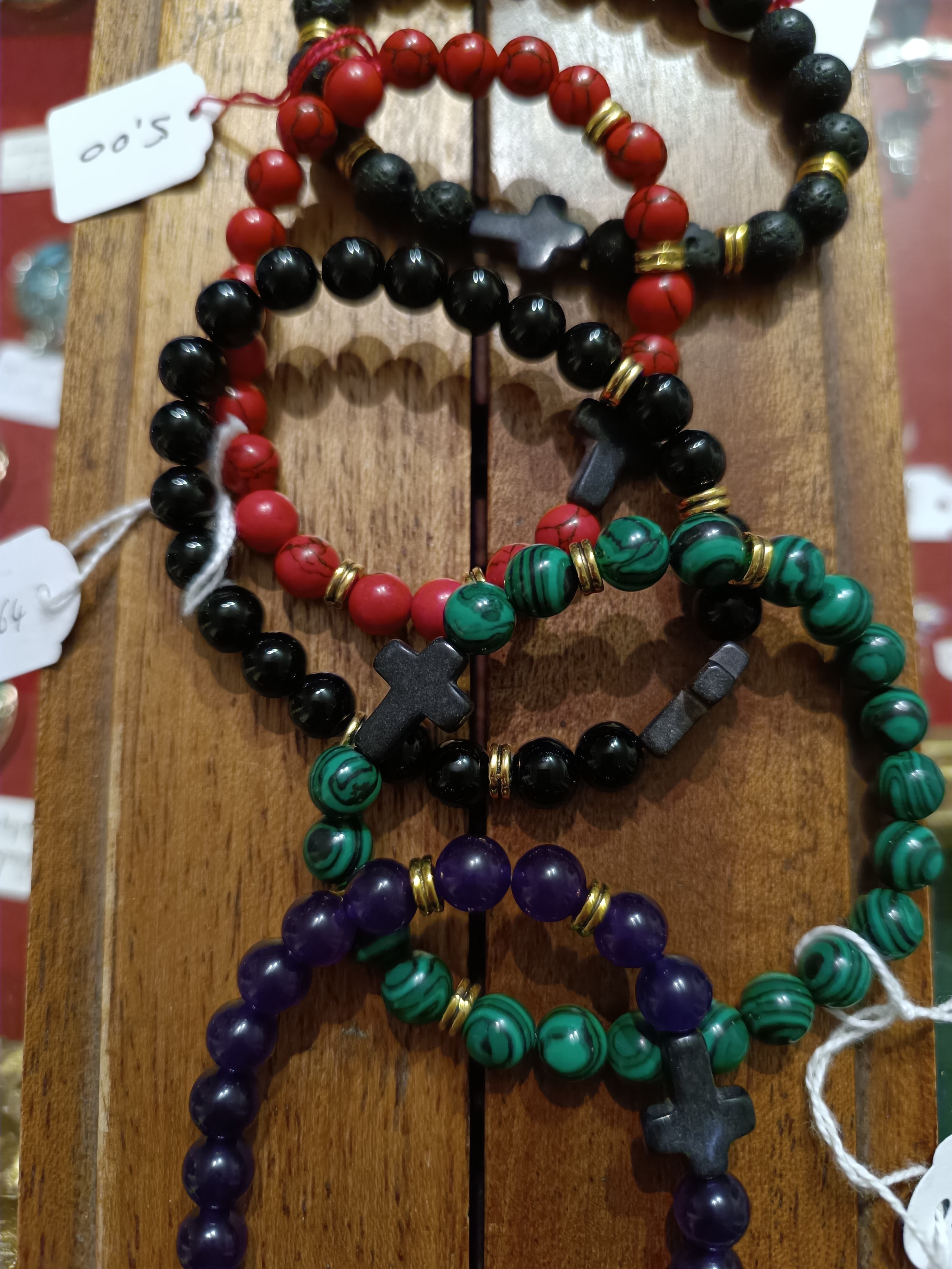 Bracelet élastique avec des imitations pierre de différents coloris, et croix noire. Avec 4 anneaux en métal doré. Quantité : 20 |