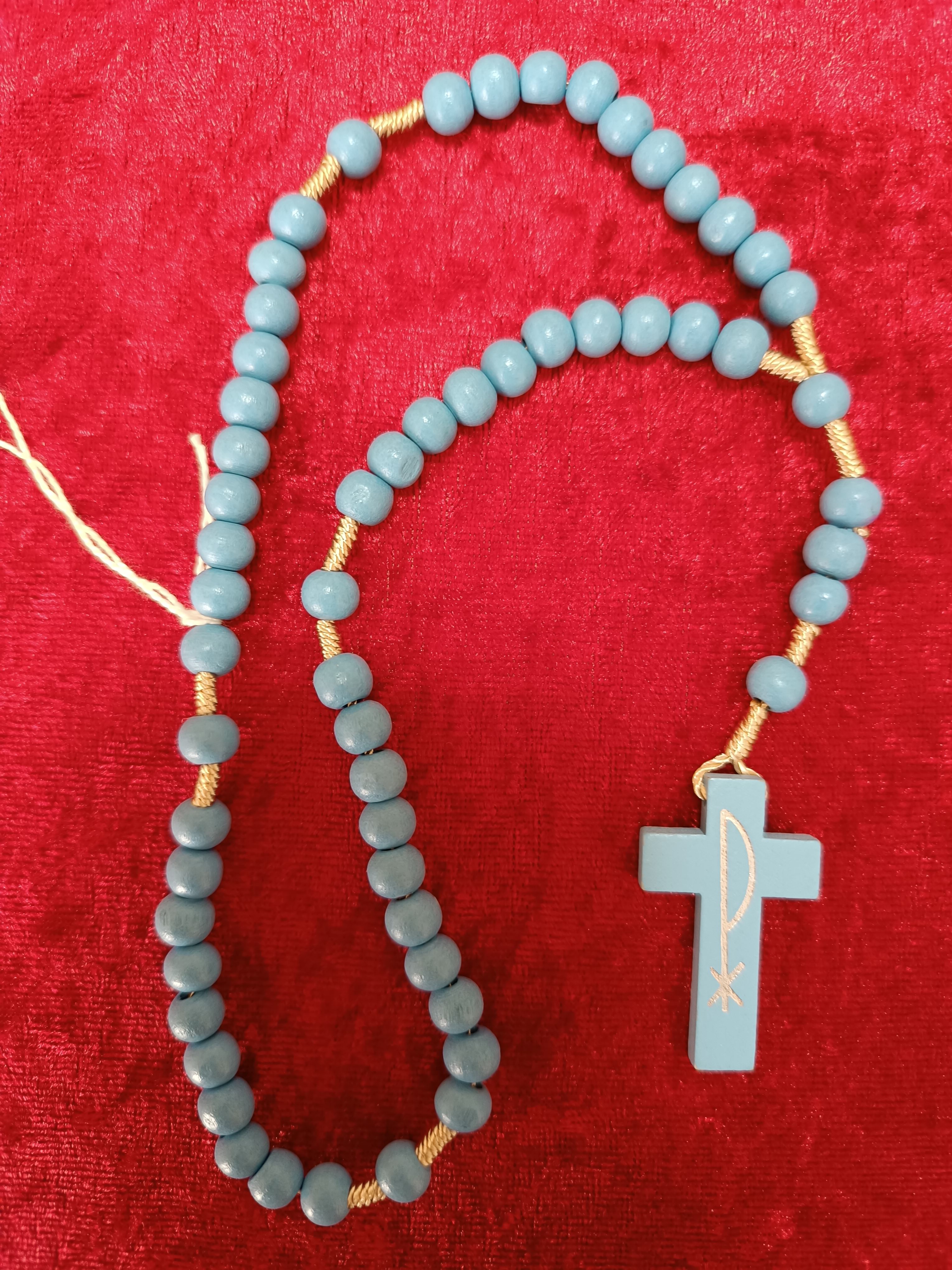 Chapelet avec grains bois bleu ciel de 8mm, pas de coeur et croix en bois bleu ciel avec symbole P peint en argenté. Lg 21+11 Quantité : 1 |
