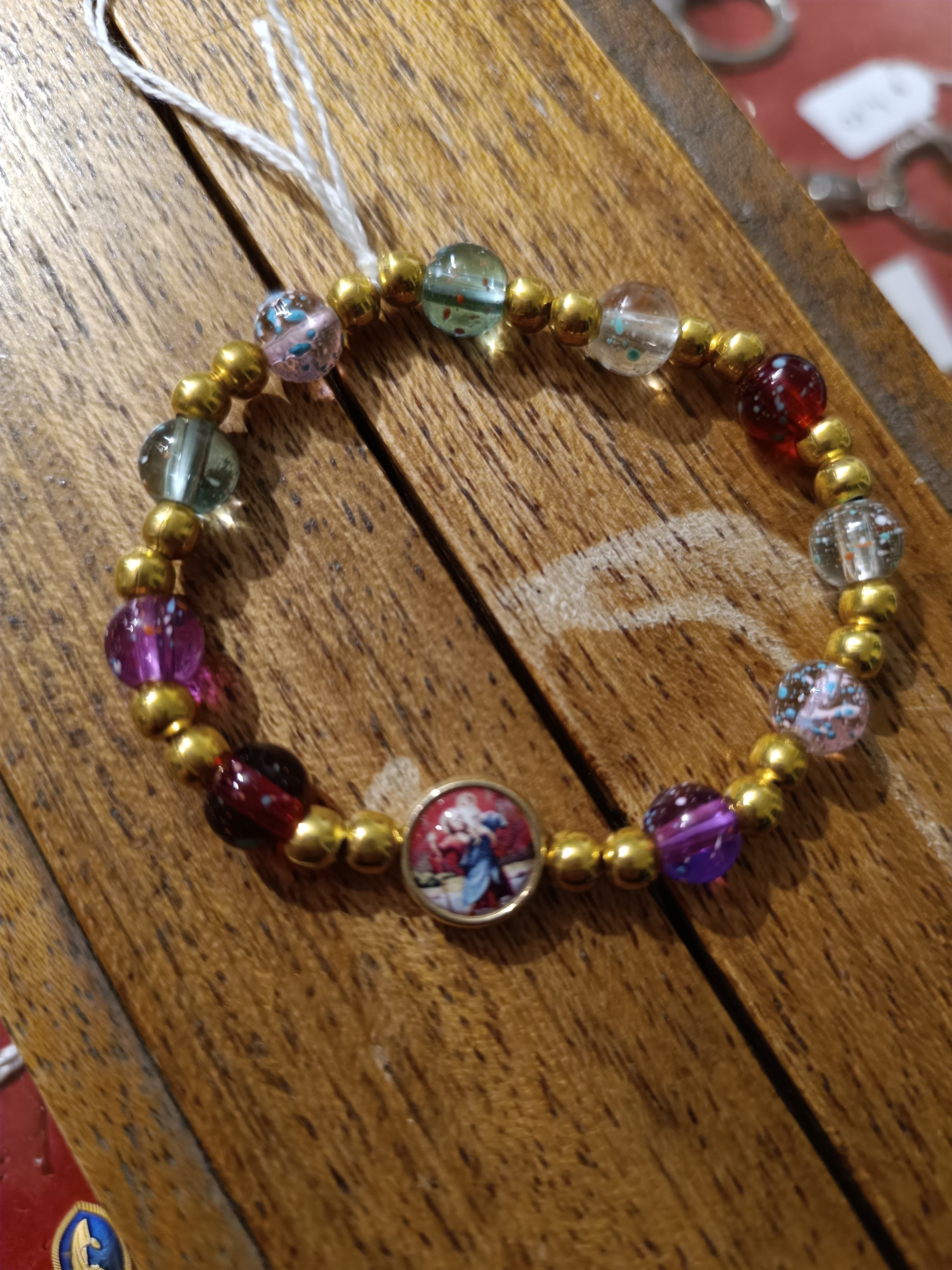 Dizainier bracelet élastique avec grains en plastique transparent multicolore rtmmet petits grains dorés. Médaille avec inclusion résine de Saint Christophe Quantité : 3 |