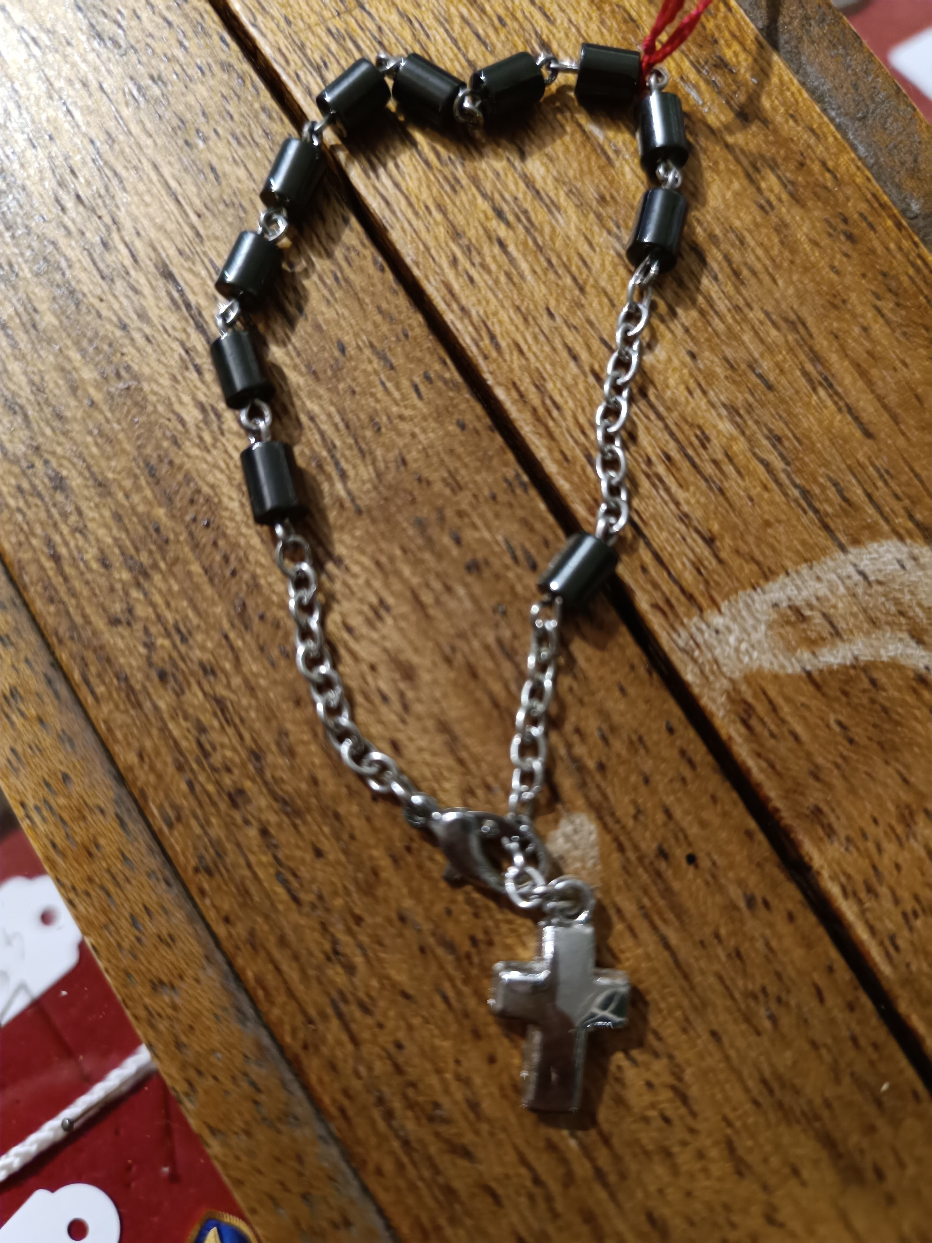 Dizainier bracelet métal avec grains cylindriques en hématite et croix en métal argenté Quantité : 3 |