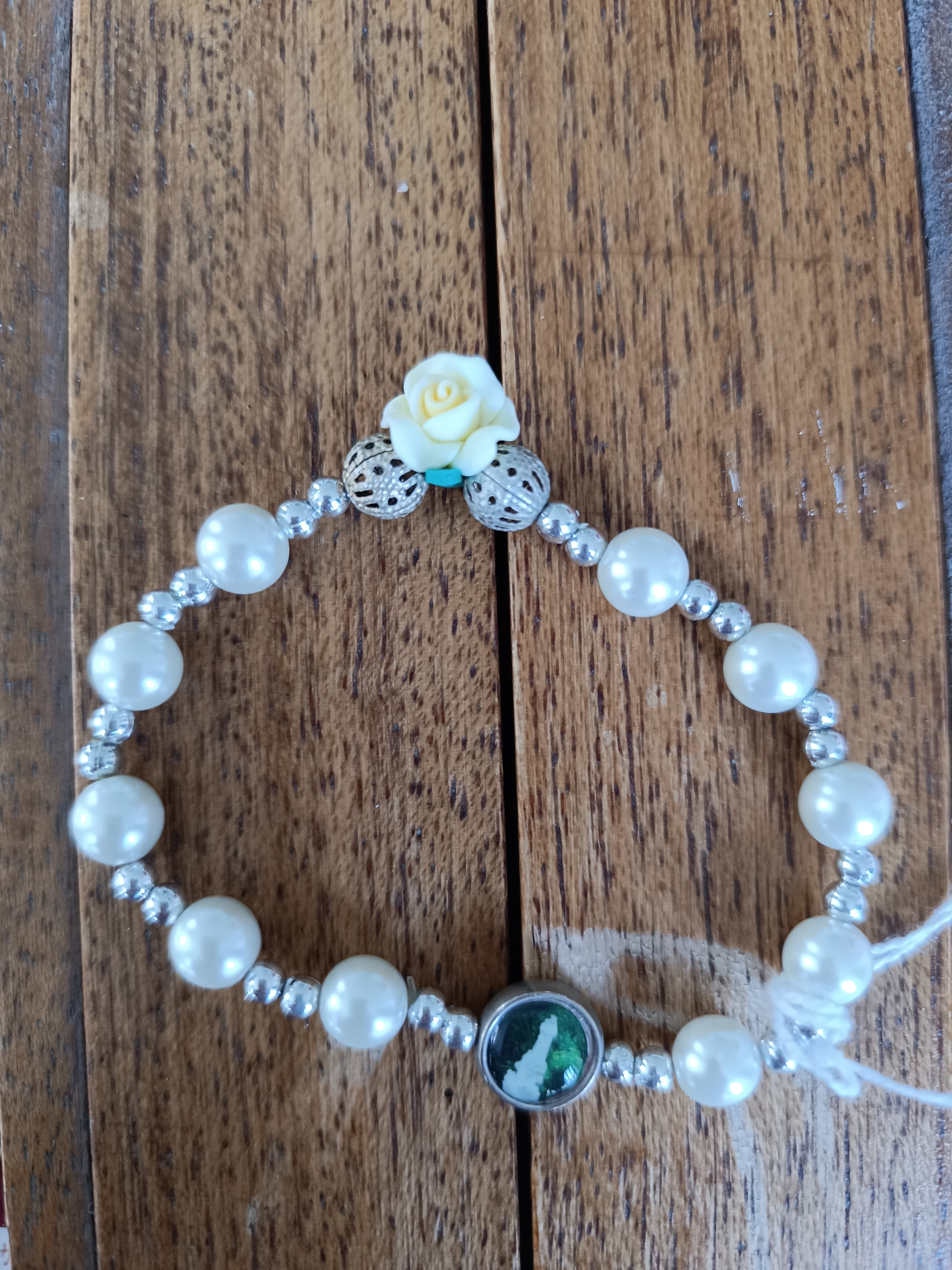 Dizainier bracelet avec grains 8mm en plastique nacré et petits grains argentés. Une rose jaune et une résine de Neuvizy. Quantité : 4 |